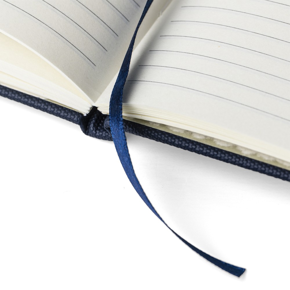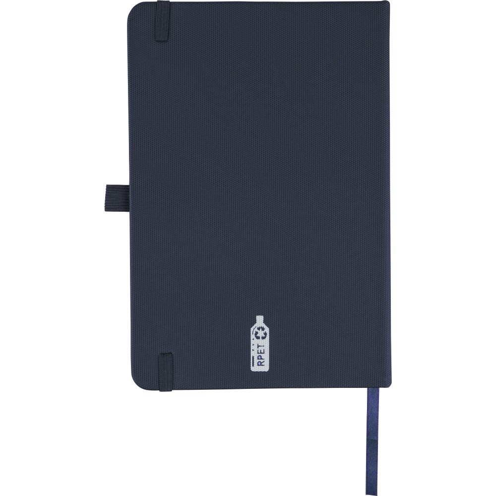 RPET 600D poliészterből készült, PU bevonatú, A5-ös jegyzetfüzet. 80 lap, 70 g/m2 vonalas papír, könyvjelző szalaggal, gumipánttal és tolltartó hurokkal. Félkemény borítású kialakítás. A hátoldalon dombornyomott recycled (újrahasznosított) alapanyagra utaló logó található. Emblémázás: Szitanyomás