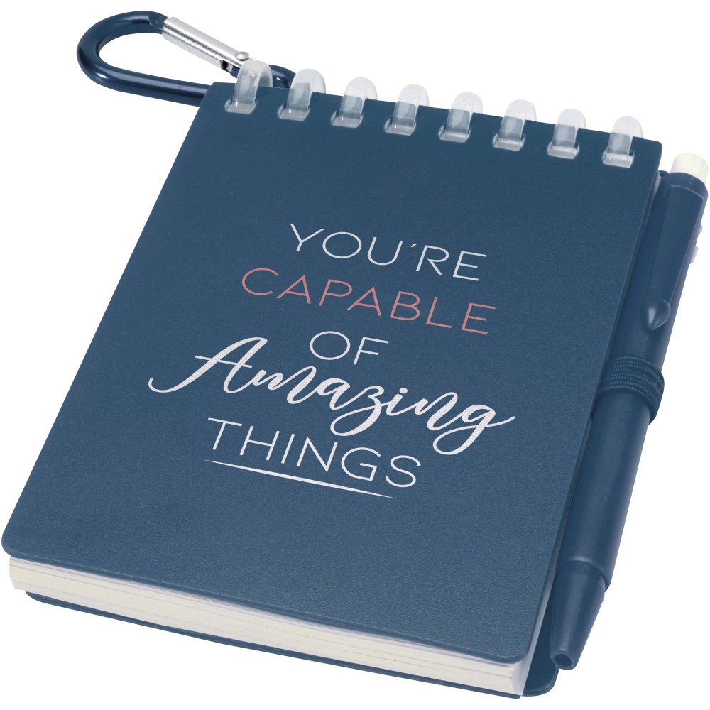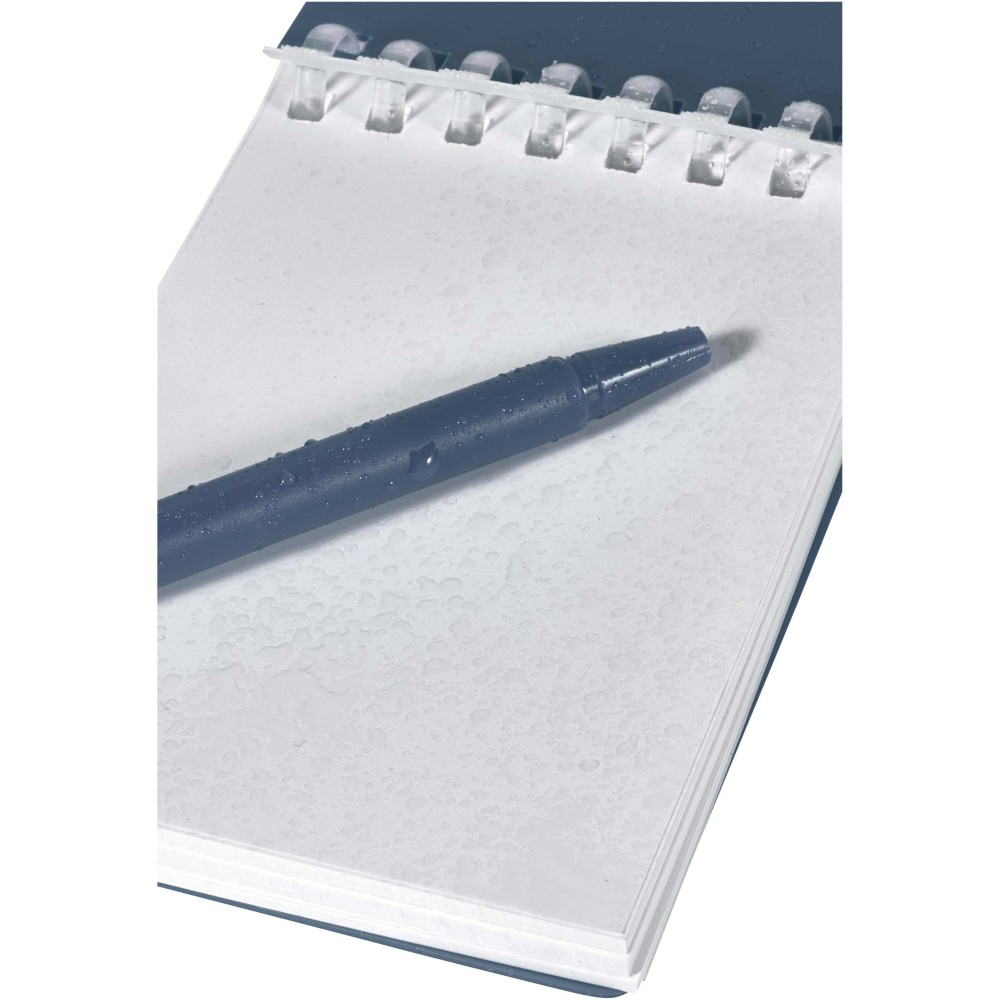 A Lig Mini jegyzetfüzet és toll szett kompakt és praktikus társ a gyors jegyzeteléshez útközben. A spirálfüzet puha, újrahasznosított műanyag borítással és 70 darab, 120 g/m2 súlyú, vízálló kőpapírból készült üres lappal rendelkezik, így ideális választás szabadtéri használatra is. A kerekített sarkokkal és beépített tolltartó pánttal ellátott kiegészítő tökéletesen követi a "mini" trendet, miközben teljesen funkcionális marad. A szetthez tartozó golyóstoll újrahasznosított ABS műanyagból készült, fekete tintával ír, íráshossza pedig 250 méter. A színben harmonizáló fémgyűrű segítségével a szett könnyen rögzíthető hátizsákra, táskára vagy kulcscsomóra, így tartós és hordozható megoldást nyújt a jegyzetek rögzítéséhez. A jegyzetfüzet mérete: 11 × 7,5 cm. Emblémázás: Szitanyomás, Tamponnyomás