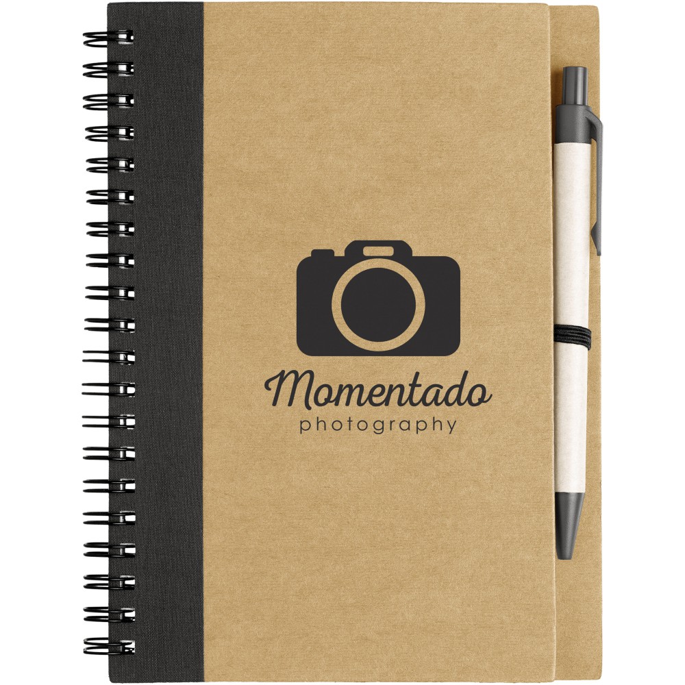Újrahasznosított papírfedelű jegyzetfüzet 60 db újrahasznosított papírból készült A6-os méretű vonalas lappal, hozzáillő tollal. A toll fekete tollbetétel érkezik és külön van csomagolva. Emblémázás: Szitanyomás, Tamponnyomás