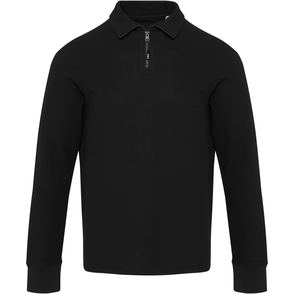 A Zeus uniszex hosszúujjú, félcipzáras felső egész évben kényelmes viseletet biztosít. Anyaga piqué kötésű, amely kellemes tapintású és tartós kialakítású. A kidolgozást finom pick stitch varrásrészletek egészítik ki, az azonos alapanyagból készült nyakszalag-erősítés pedig hozzájárul a hosszabb élettartamhoz. Az oldalsó sliccek, szintén saját anyagból készült betétekkel, nagyobb mozgásszabadságot tesznek lehetővé. A hőtranszferes márkajelzés cimkementes komfortot nyújt. A termék AWARE nyomonkövetesi technológiával van ellátva, amely egy digitális termékútlevelet tartalmaz, igy biztosítva az átláthatóságot és a fenntarthatósági jellemzők bemutatását. 100% pamut, 245 g/m2. Emblémázás: Hímzés