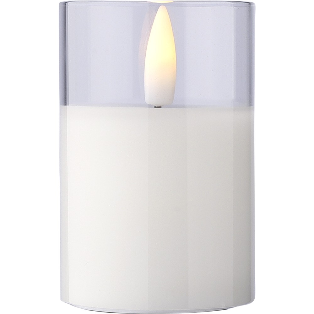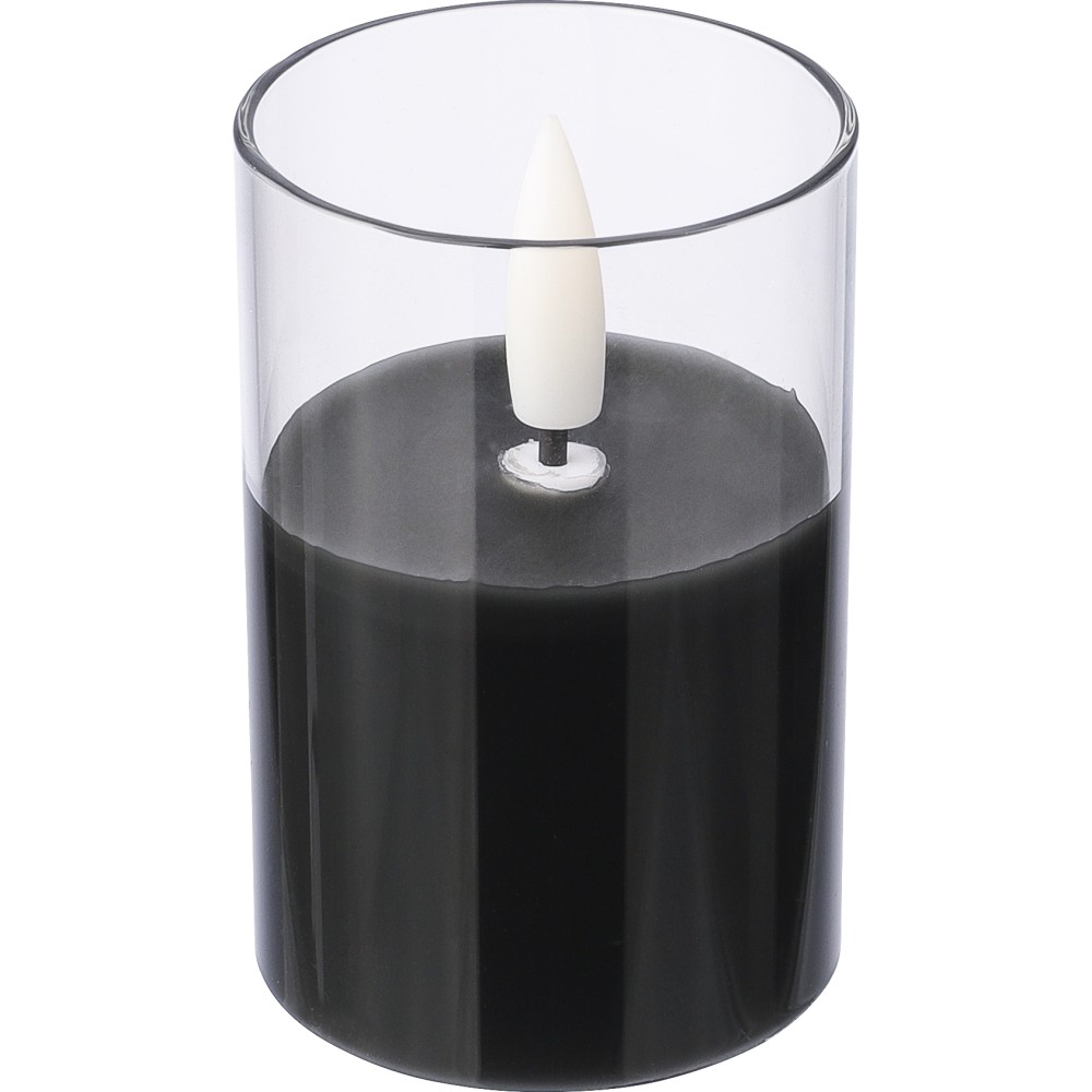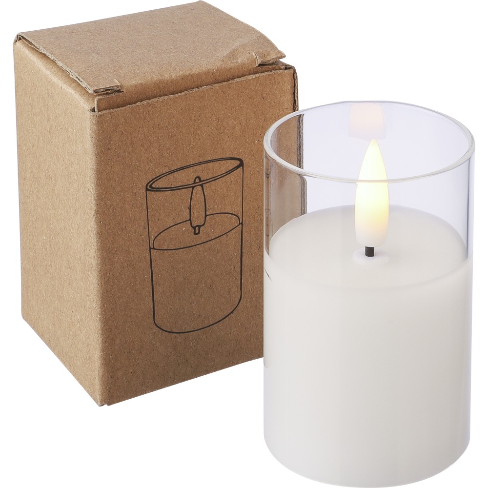 PP LED gyertya üvegtartóban, valósághű lánghatással. Elemmel együtt, körülbelül 100 órás égési idővel. Beltéri használatra tervezve. Egyenként csomagolva, barna kartondobozban. Emblémázás: Tamponnyomás
