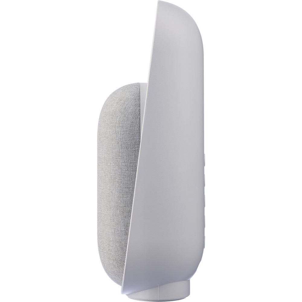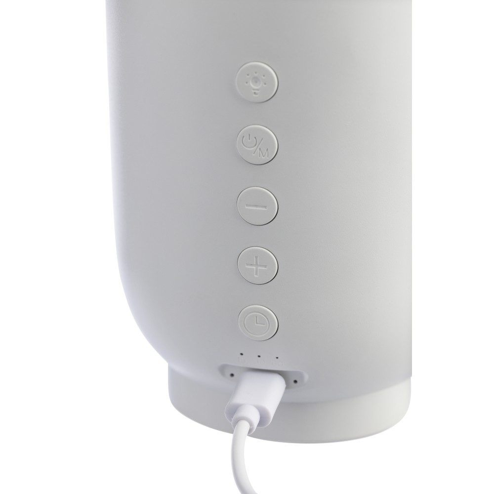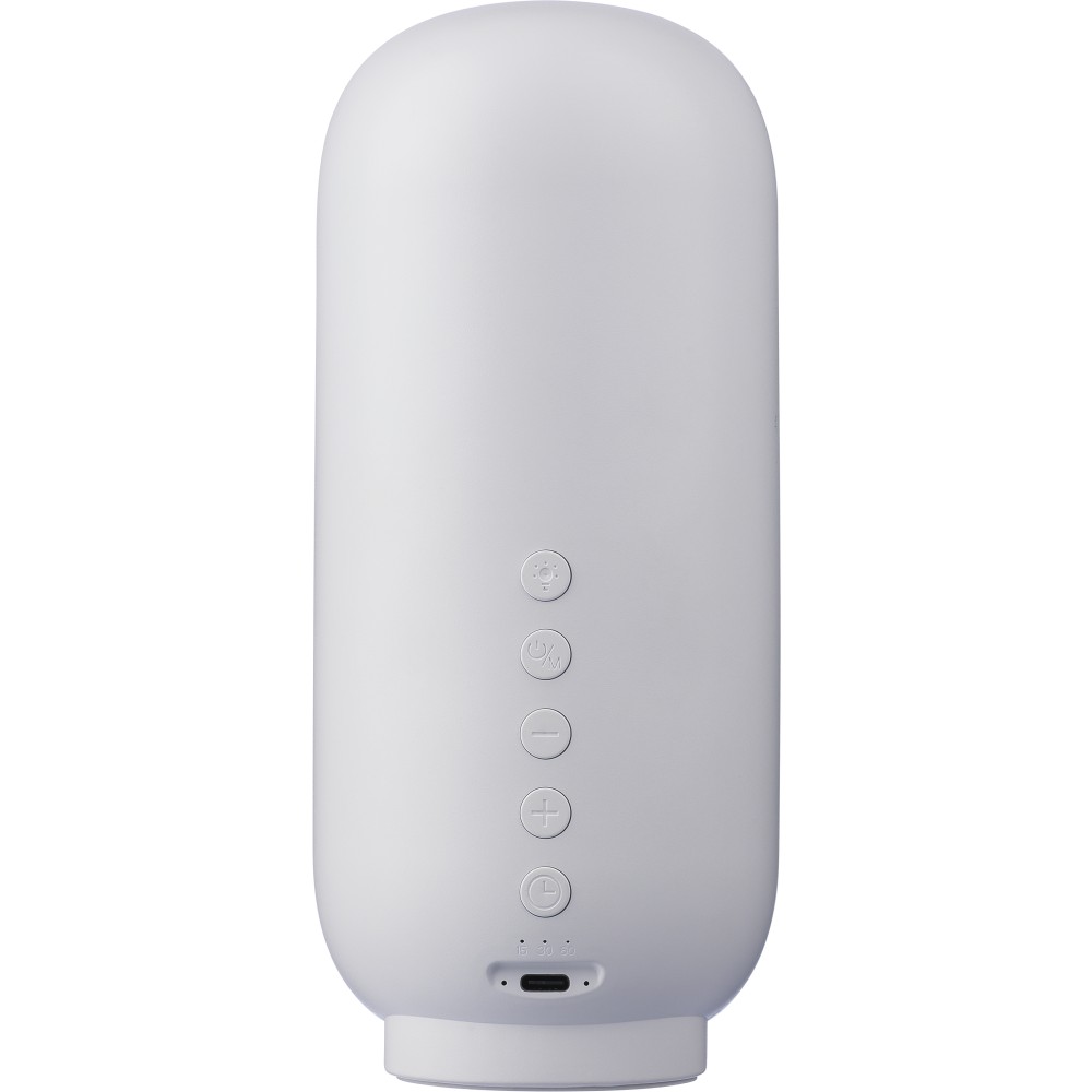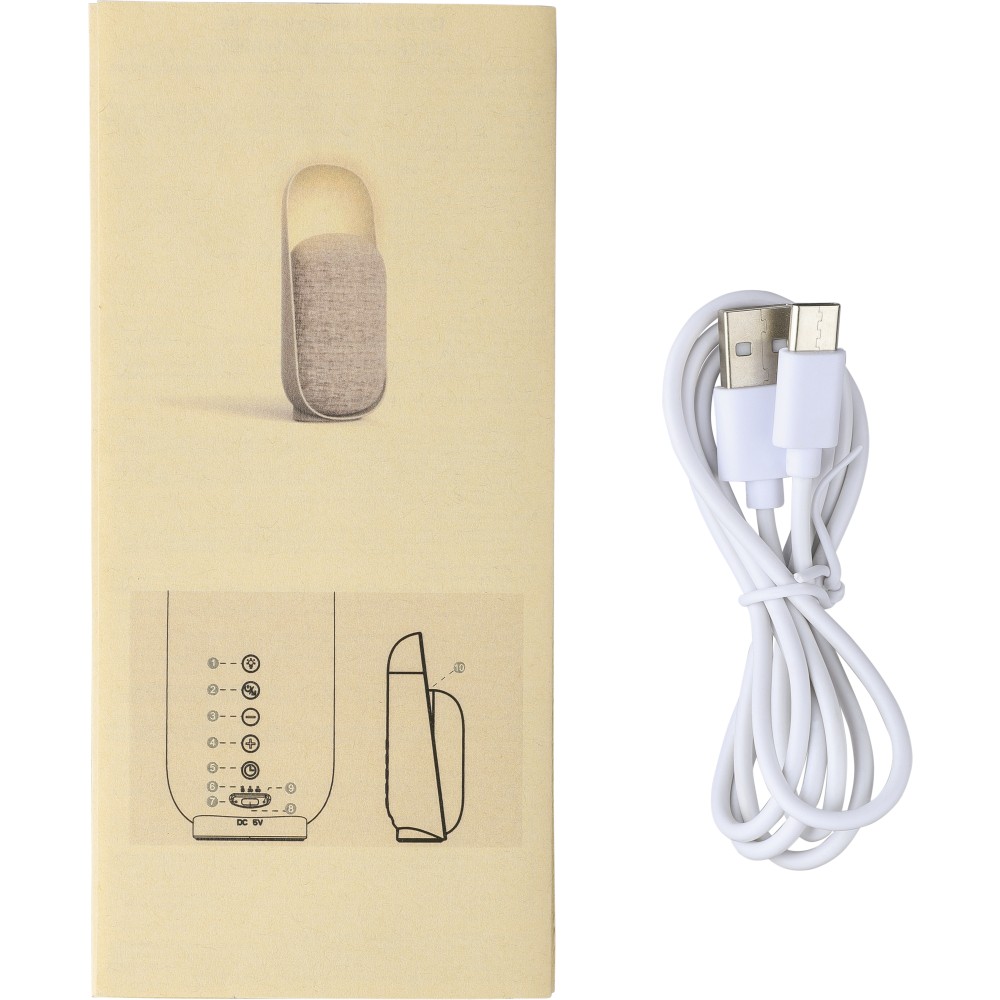 Újrahasznosított ABS és rPET anyagból készült 3-in-1 hangszóró, lámpa és alvásterapeuta. 3W-os hangszóróval, 5.3-as vezeték nélküli technológiával, hatféle alváshoz való hanggal, időzítővel, állítható LED fénnyel és 1200 mAh-s akkumulátorral. 1 m-es kábel tartozik hozzá. Csomagolása barna papírdoboz. Emblémázás: Tamponnyomás