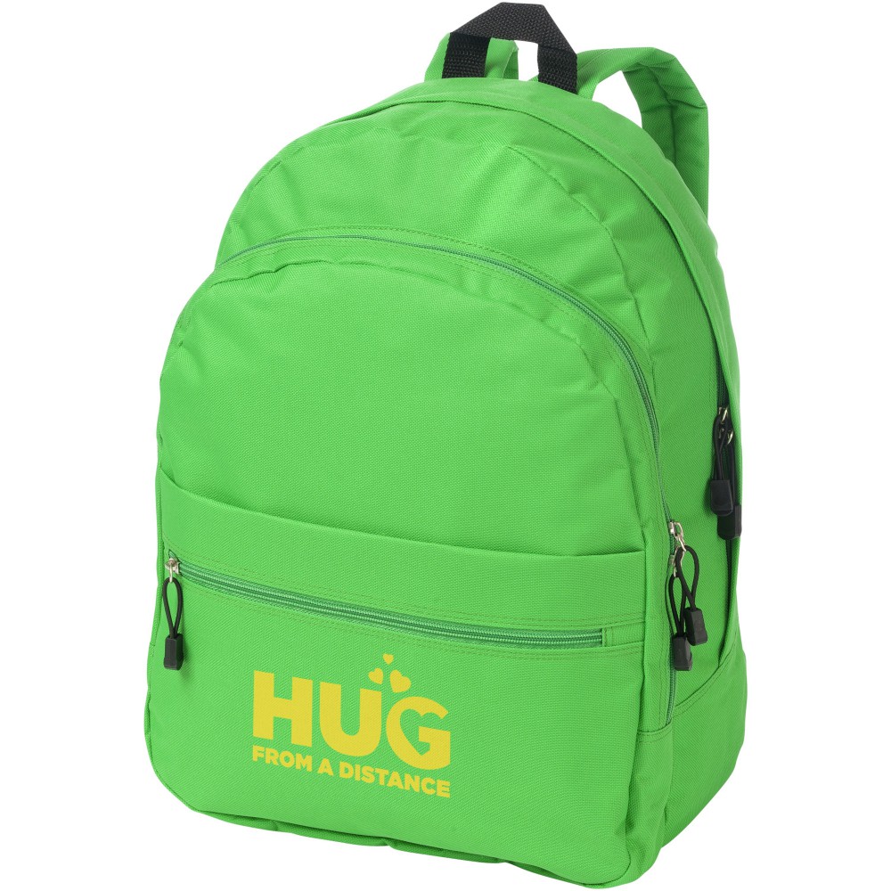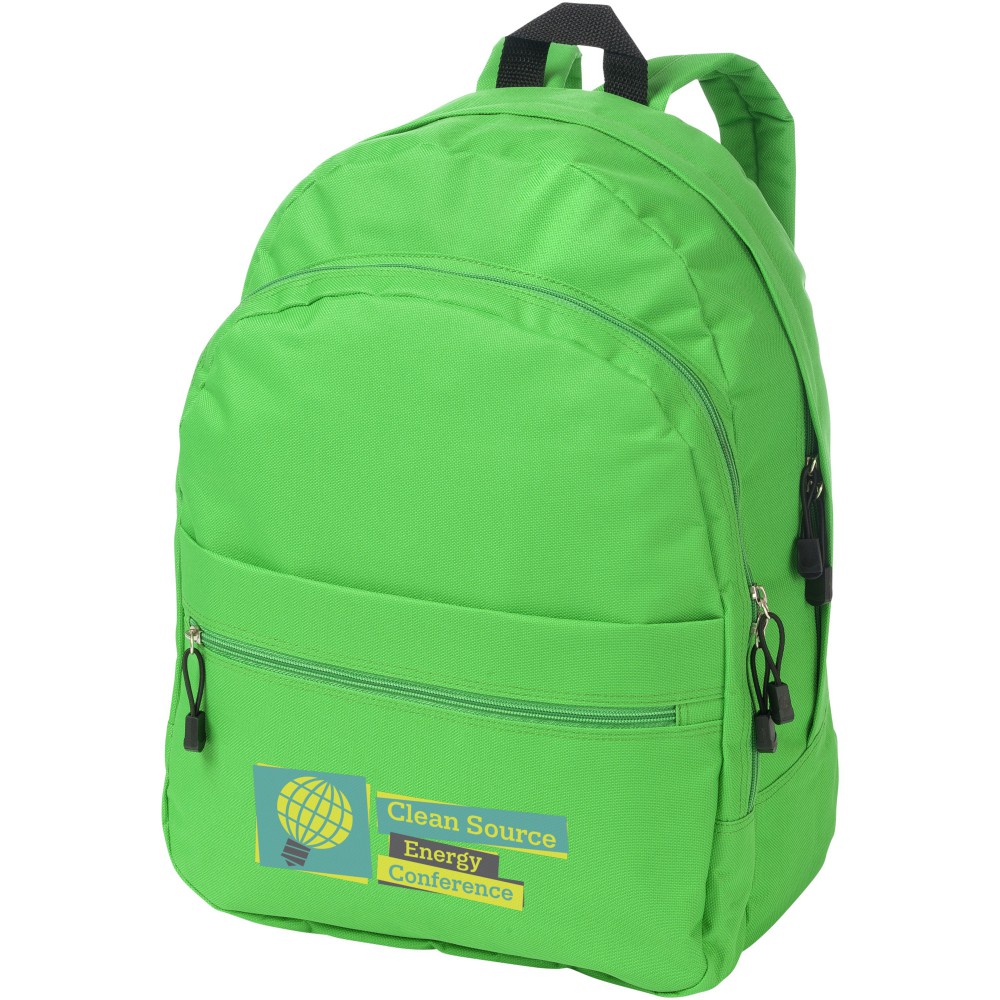 A kényelmes Trend hátizsák nyerő a promóciós hátizsákok között. A divatos kialakítású táska négy rekesszel rendelkezik: két cipzáras rekesszel, egy elülső cipzáras zsebbel és egy tépőzáras elülső zsebbel, így bőséges helyet kínál nagy és kis tárgyak tárolására egyaránt. A termék 600D poliészterből készült. Emblémázás: Hímzés, Szitanyomás
