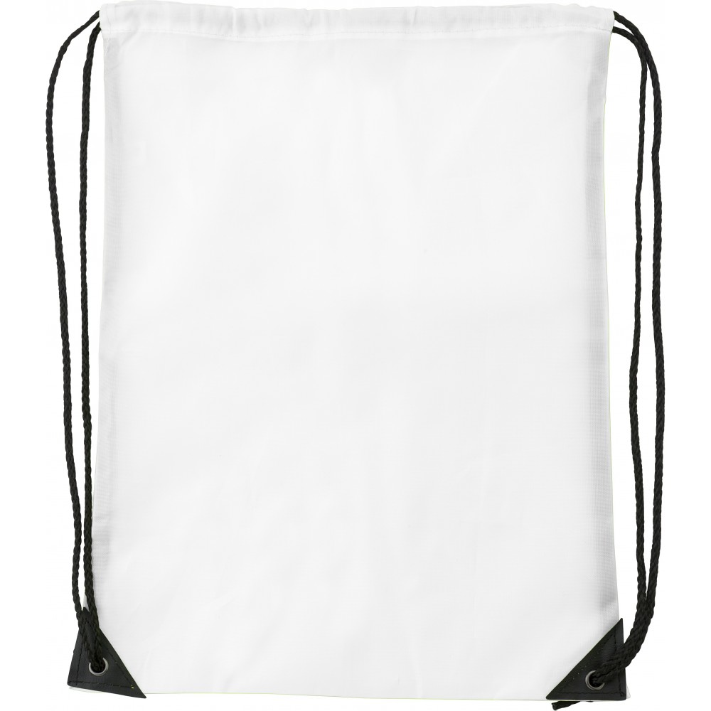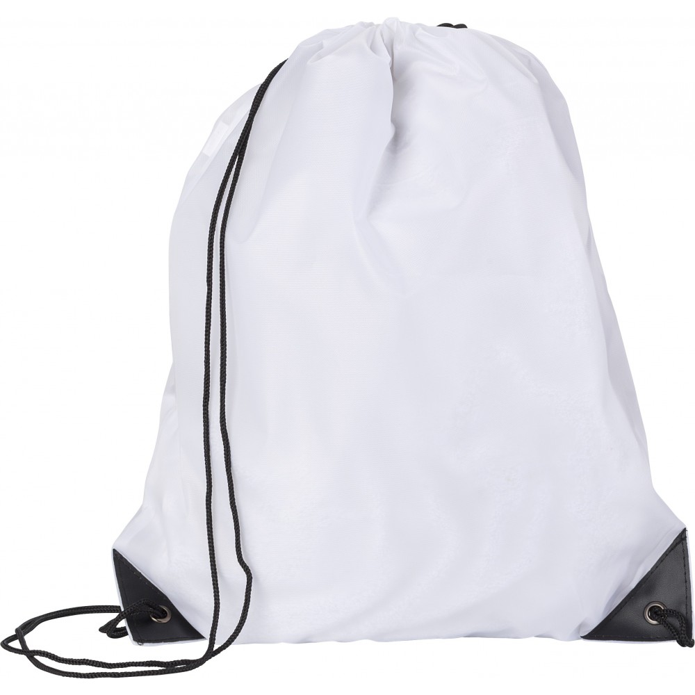 Tornazsák erősített sarkokkal és nylon húzózsinórral. 210D poliészter. Emblémázás: Szitanyomás