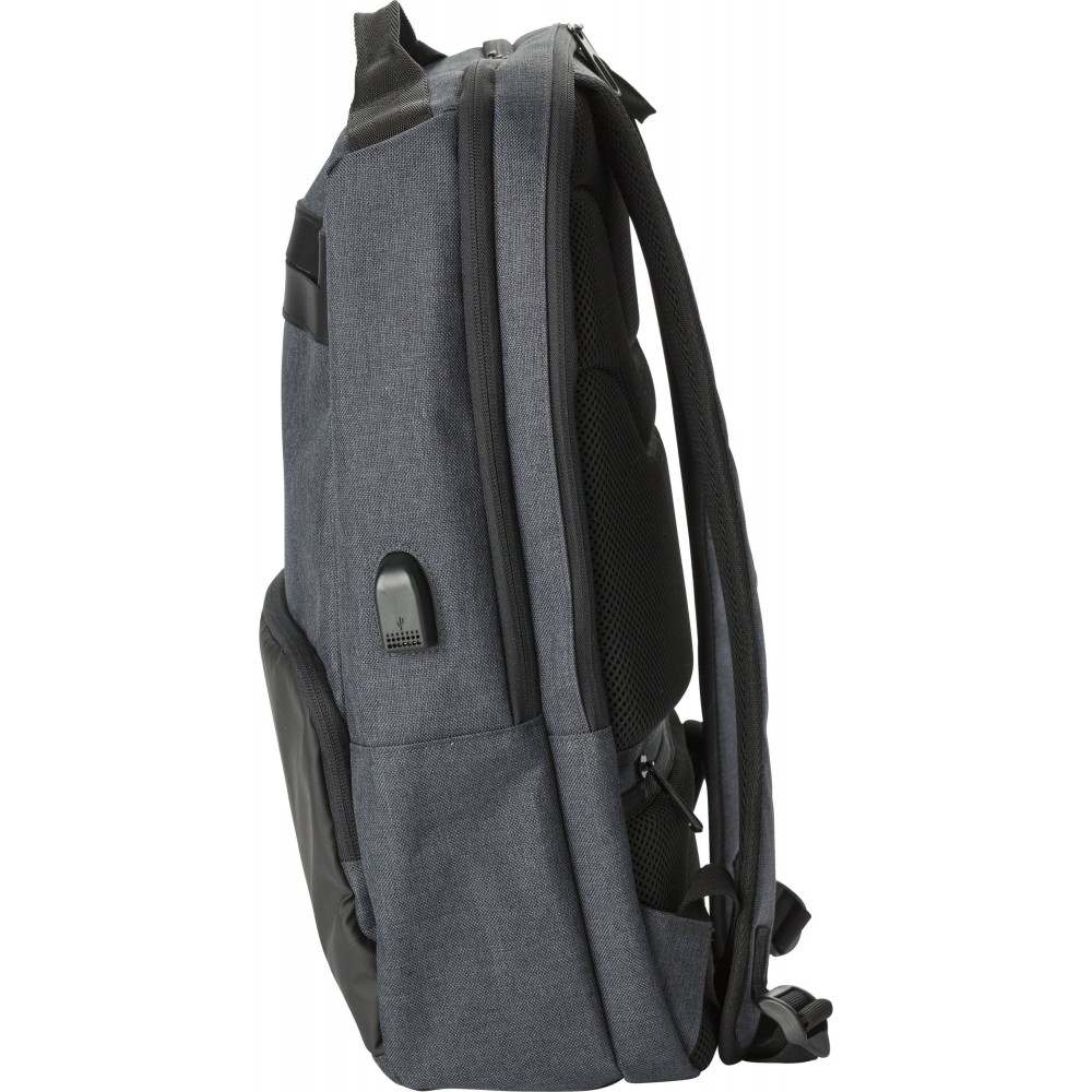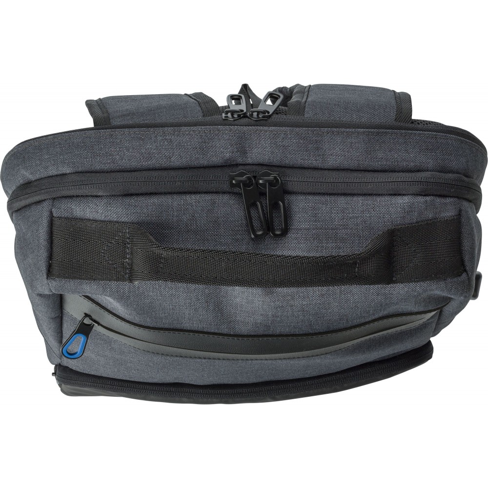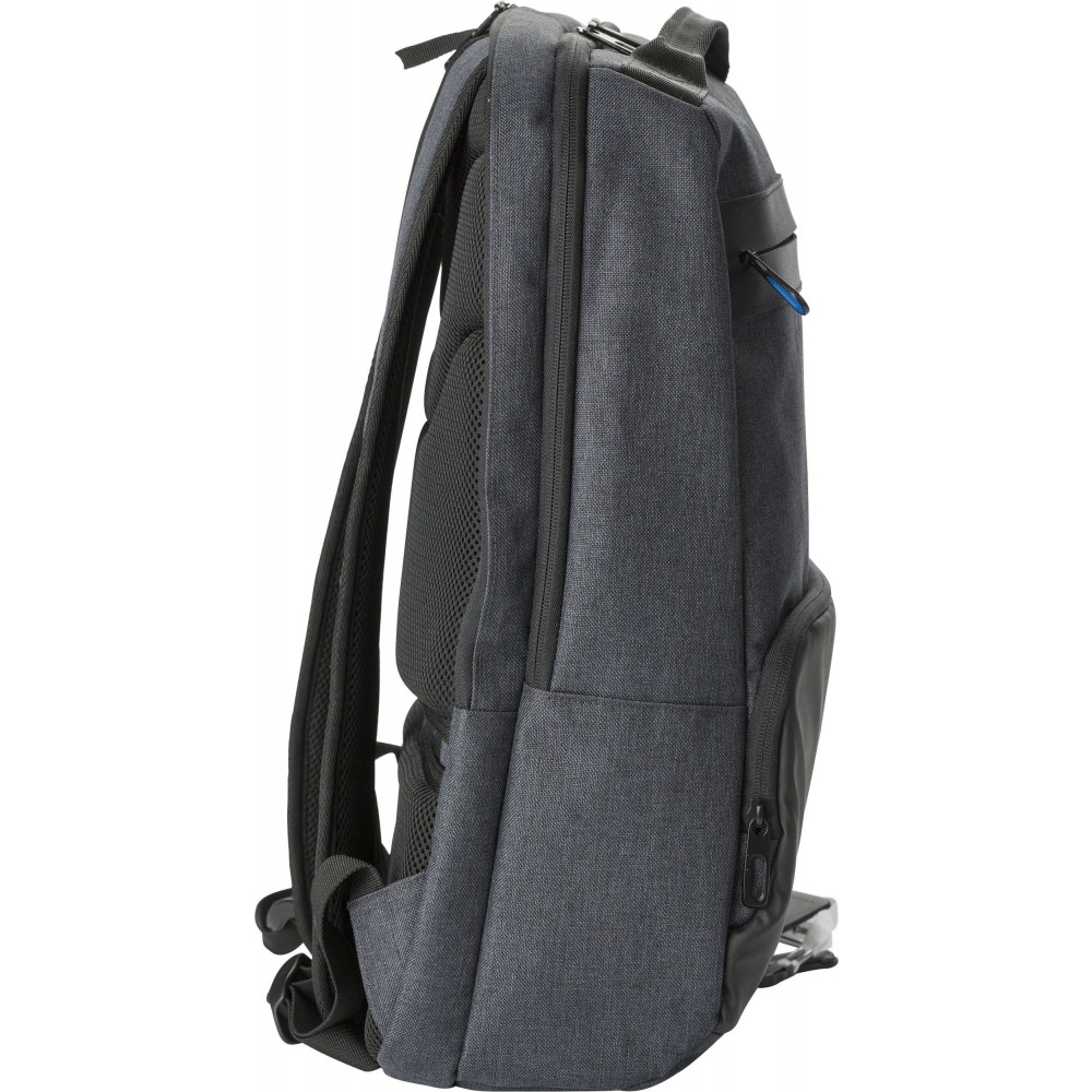 Hátizsák két fő rekesszel, amelyből az egyik laptop tárolására is alkalmas. Hátulján lopásgátló zsebbel és elöl két cipzáras zsebbel rendelkezik. Az oldalán USB csatlakozással. Párnázott, állítható vállpánttal. PVC. Emblémázás: Szitanyomás