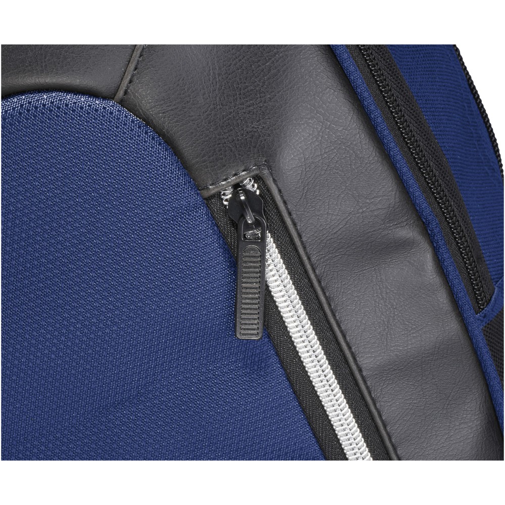 Elegáns, trendi, 15,6 -es laptop hátizsák nagy cipzáras, kulcstartós első zsebbel és rejtett RFID technológiájú blokkoló zsebbel a kártyák és okmányok adatlopás elleni védelme érdekében. A nagy, cipzáras fő tárolórész 15,6 -es laptop tárolására alkalmas, és elkölönített, párnázott résszel rendelkezik iPad vagy tablet számára. Az első, függőleges cipzár nyújt hozzáférést az első zsebhez. Két kiegészítő oldalzseb további tárolási lehetőséget biztosít, a párnázott, állítható vállpántok kényelmes viseletet nyújtanak, a hordozófül és a gurulós bőröndre húzható zseb lehetővé teszi a könnyű hordozást. Emblémázás: Szitanyomás
