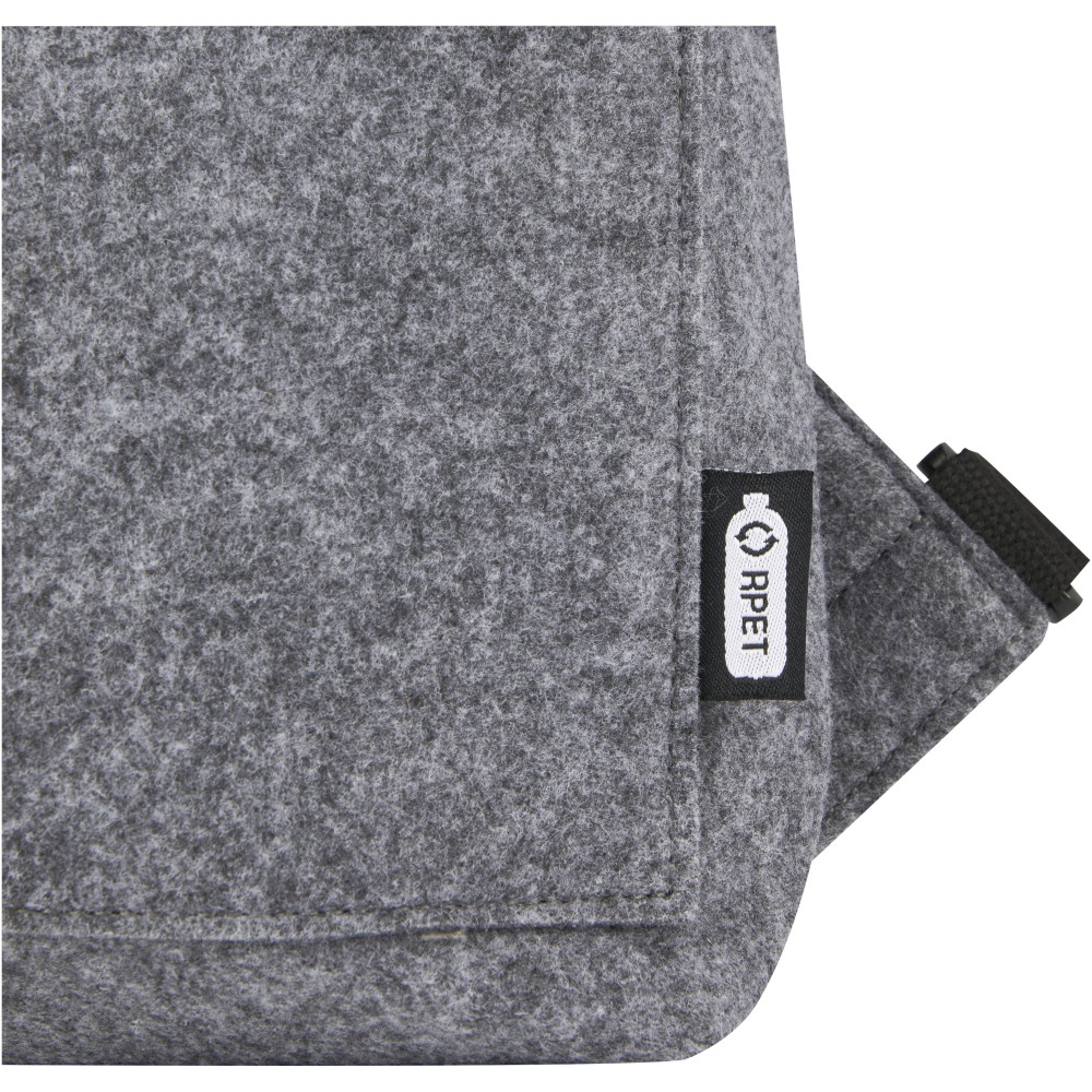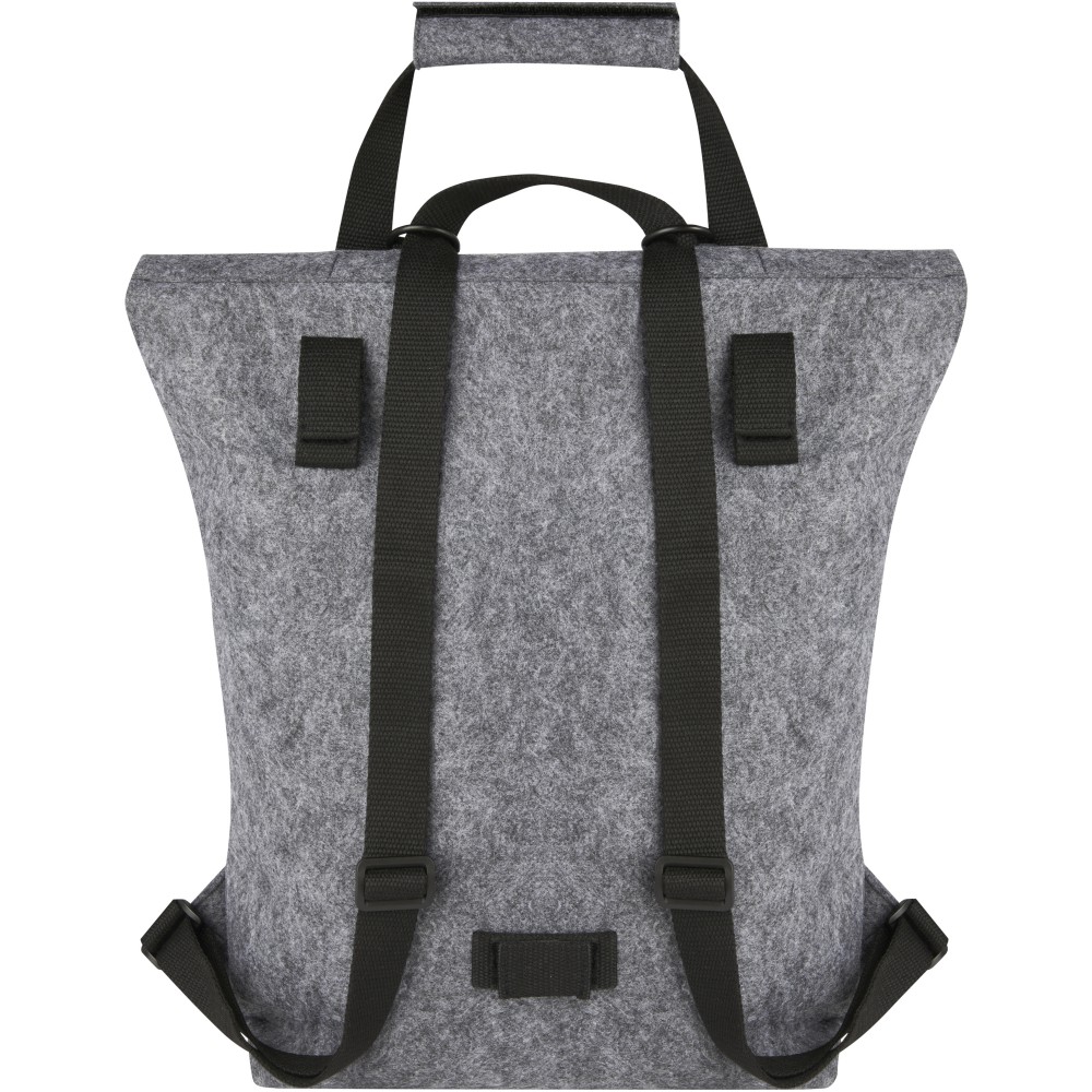 Többfunkciós és trendi kombinált roll-top hátizsák és kerékpártáska kiváló minőségű, puha és tartós GRS tanúsítvánnyal rendelkező újrahasznosított filcből. Nagy fő rekesszel, elülső zsebbel, állítható vállpántokkal és 3 akasztós pánttal, amellyel a táskát a kerékpár hátuljához rögzítheti. A vállpántok könnyen átalakíthatók hosszú füllé, vagy behajthatóak, így a hevederek nem akadnak be a kerékpár kerekébe. Emblémázás: Hímzés, Szitanyomás