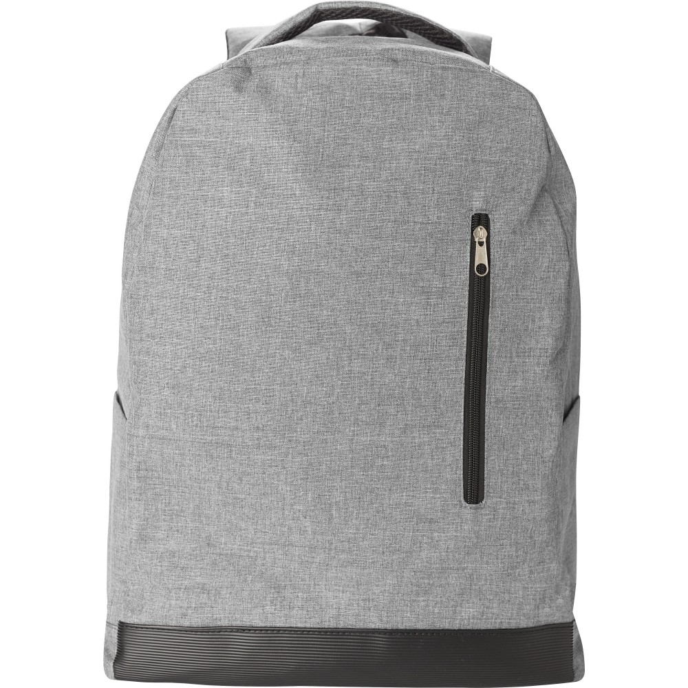 600D RPET poliészter lopásgátló hátizsák hátul gurulós bőröndre húzható pánttal. Elöl egy kis cipzáros zseb. Mindkét oldalán palacktartó zseb. Belül egy nagy rekesz tépőzáras laptop zsebbel. Alkalmas nagyméretű laptopokhoz. Állítható vállpántok. Alul egy kis bélelt rész újrahasznosított autógumiból. Emblémázás: Szitanyomás