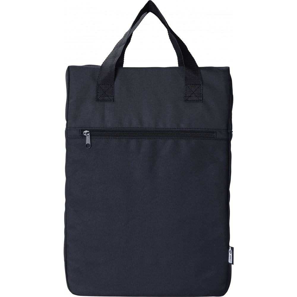 Hátizsák egy nagy rekesszel és egy cipzáras első zsebbel. Felső oldalán fülek. 600D RPET poliészter. Emblémázás: Szitanyomás
