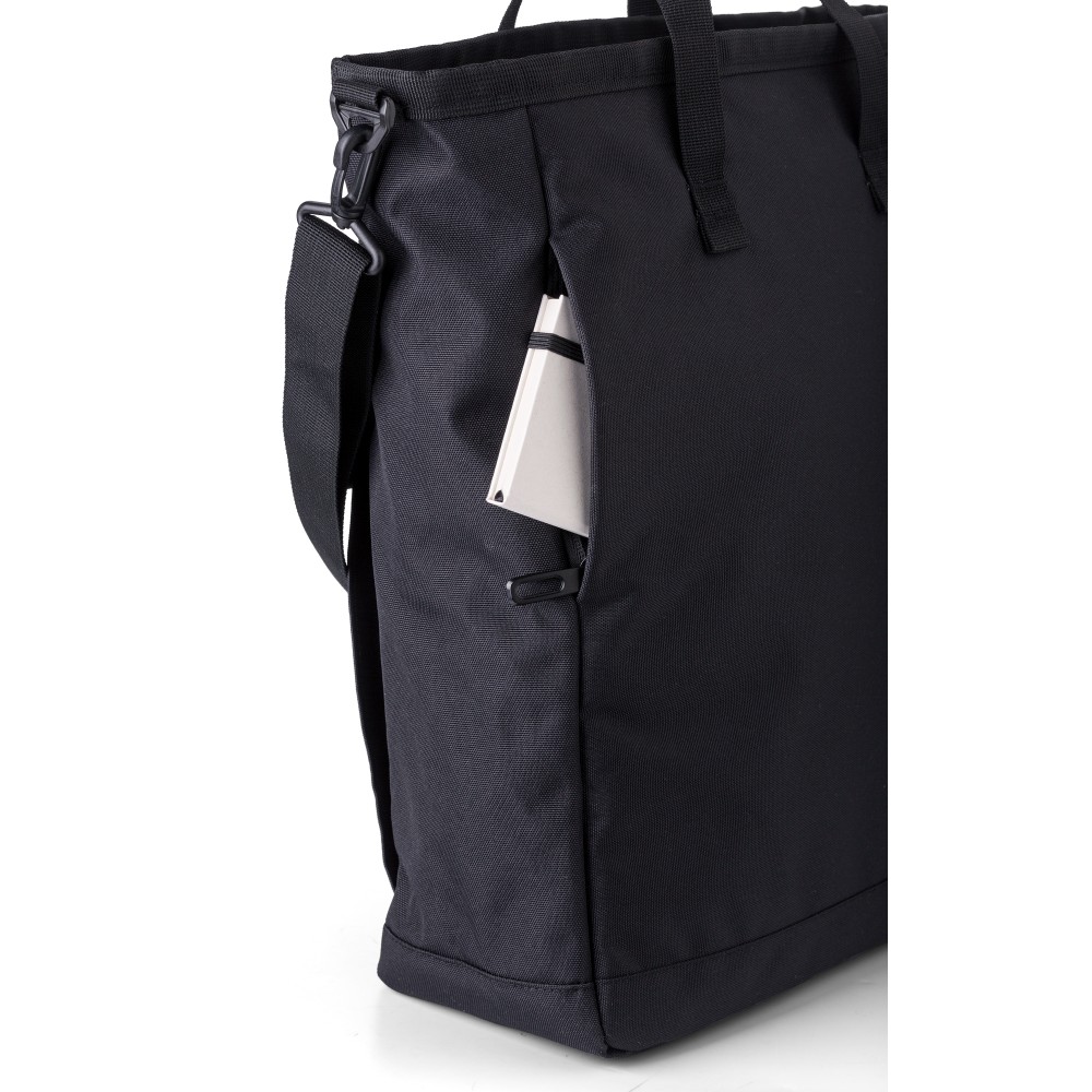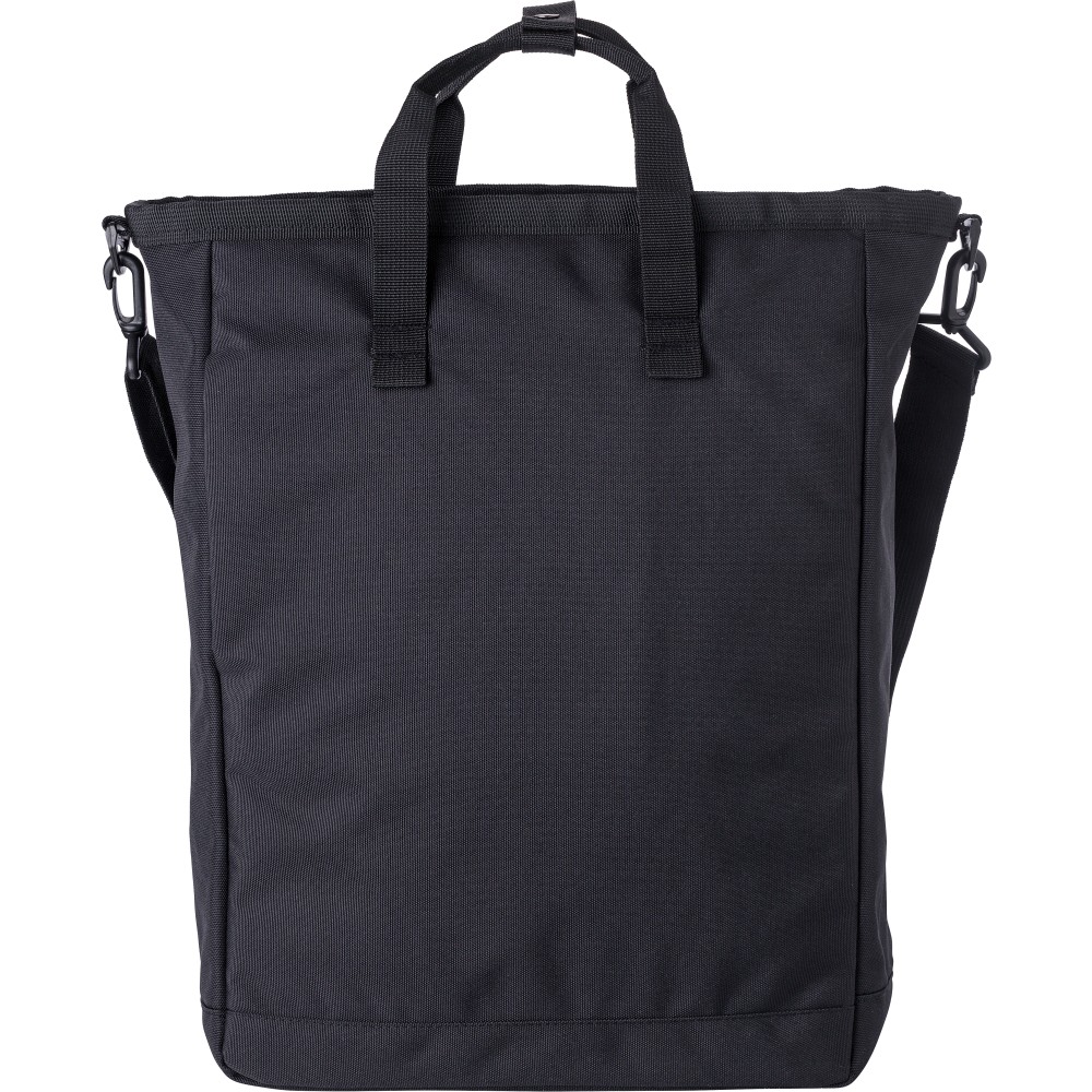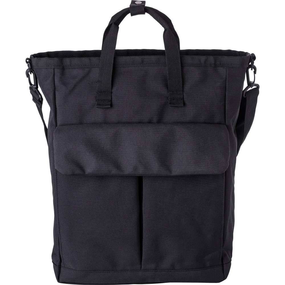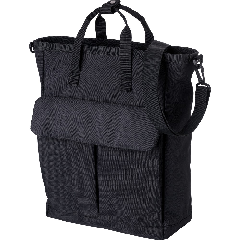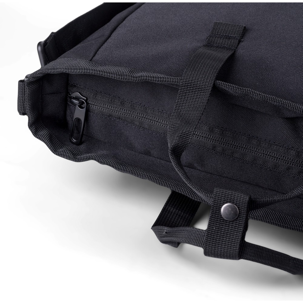 Poliészter (900D) válltáska. Két tépőzáras zseb az elülső oldalon, egy nagy cipzáras rekesz a tetején és egy cipzáras rekesz a hátoldalon. Több rekesz belül, köztük egy laptop rekesz (15 colos). A táska állítható pántokkal és rövid fogóval rendelkezik. Emblémázás: Szitanyomás