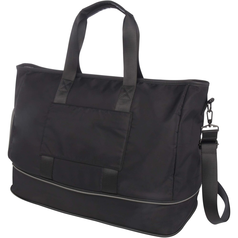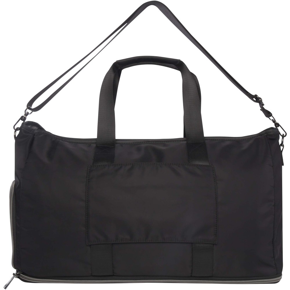 A Rhine bővíthető sporttáska stílusos kialakításával és sokoldalúságával tökéletes választás különféle alkalmakra. Kiváló minőségű, GRS tanúsítvánnyal rendelkező újrahasznosított nejlonból készült, puha RPET béléssel és prémium PU bőr elemekkel. A táska tágas főrekesszel rendelkezik, amely egy nagy, szivárgásmentes TPU zsebet, két nyitott zsebet és egy dedikált cipőtartó rekeszt tartalmaz. A hátoldalon található egy biztonságos rejtett zseb, amely egyben bőröndpántként is funkcionál. Az állítható, levehető vállpánt maximális kényelmet biztosít. A táska különlegessége a bővíthető réteg, amely akár 42 literes kapacitásra növelhető. Alap kapacitása 35 liter, maximális terhelhetősége 20 kg. PVC-mentes. Emblémázás: Szitanyomás