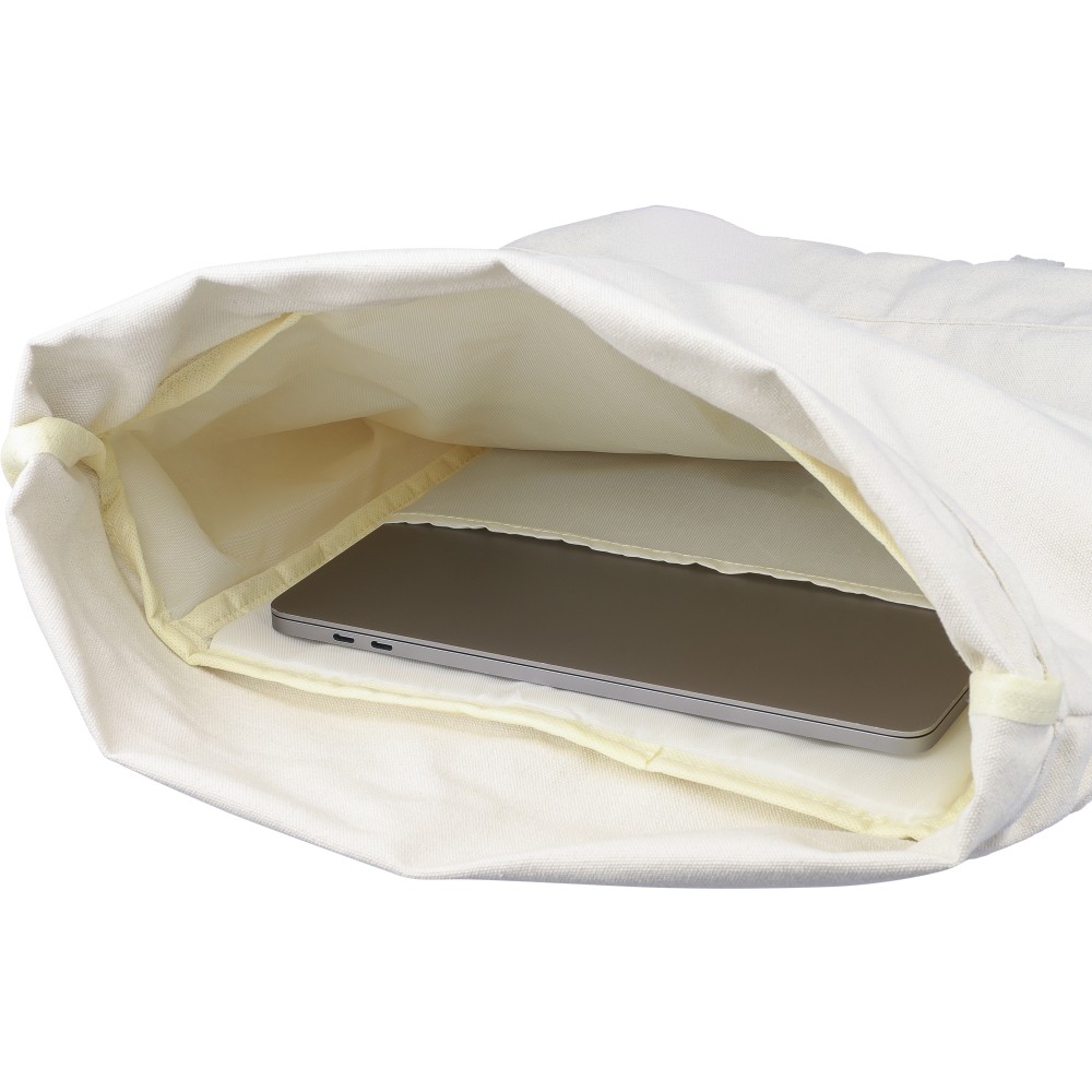 Rolltop hátizsák 330 g/m2 újahasznosított policotton anyagból, 210D poliészter béléssel és műanyag csattal. 15 literes űrtartalommal, egy nagy cipzáras rekesszel, 15"-es laptoptartó résszel, két belső és egy külső rekesszel. Tetején hordozófüllel, párnázott, állítható vállpánttal és egy kicsi, cipzáras elsőzsebbel. Teherbíró képessége 14 kg. Címkét tartalmaz. Emblémázás: Hímzés, Szitanyomás