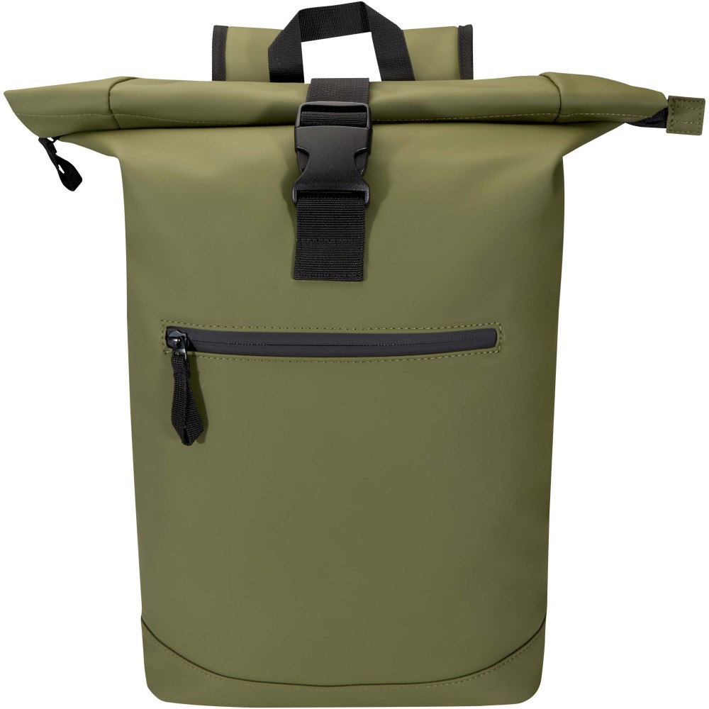 Prémium, újrahasznosított PU bőrből készült, színben harmonizáló RPET béléssel, ez a rolltop hátizsák modern megjelenést és hosszú élettartamot kínál. Vízlepergető felülete megóvja a tartalmát esőtől és nedvességtől, míg a feltekerhető zárórész rugalmas pakolást tesz lehetővé - ideális laptop hátizsákként ingázáshoz, utazáshoz vagy edzőterembe. Belsejében párnázott rekesz található, amely akár 15,6" laptopot is biztonságosan tárol, valamint egy cipzáras zseb a technikai eszközök és mindennapi kellékek rendszerezésére. A külső részen vízálló cipzárral ellátott elülső zseb biztosít gyors és biztonságos hozzáférést, míg a párnázott, állítható vállpántok és a légáteresztő hátpanel egész napos kényelmet nyújtanak. Emblémázás: Szitanyomás
