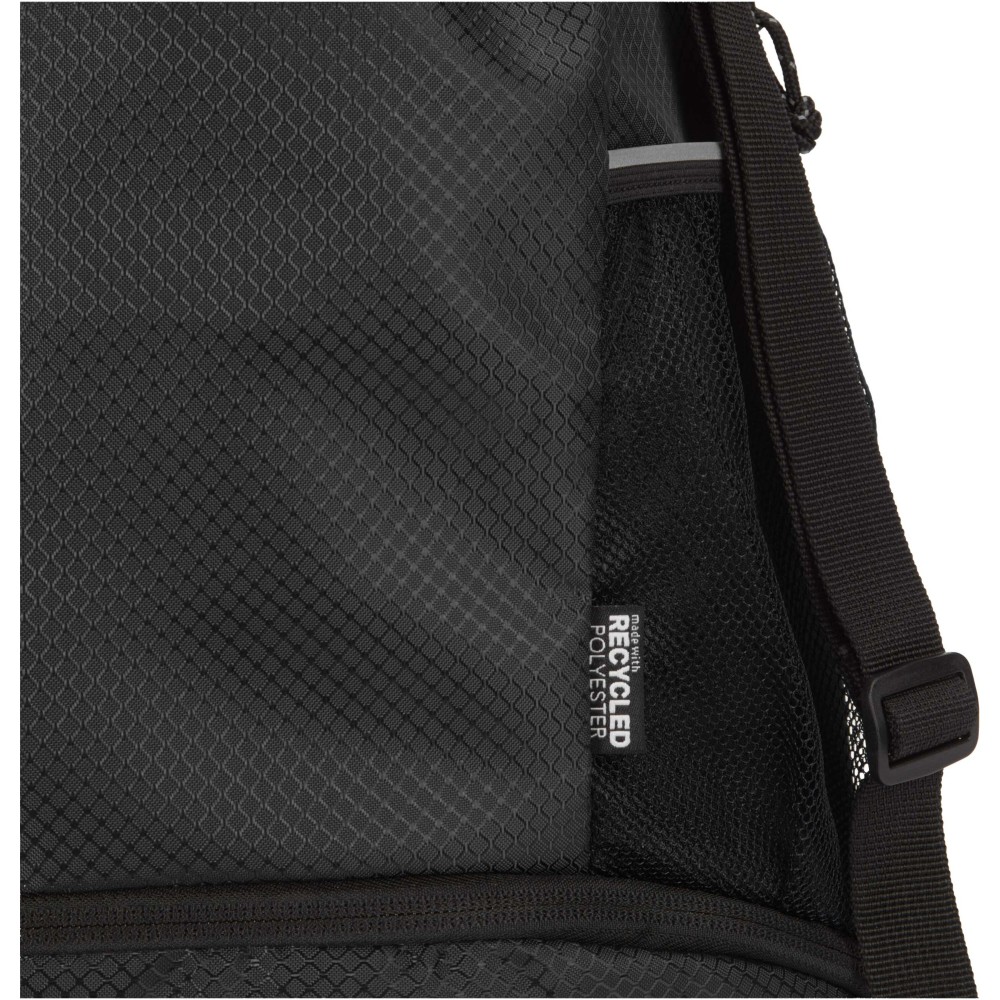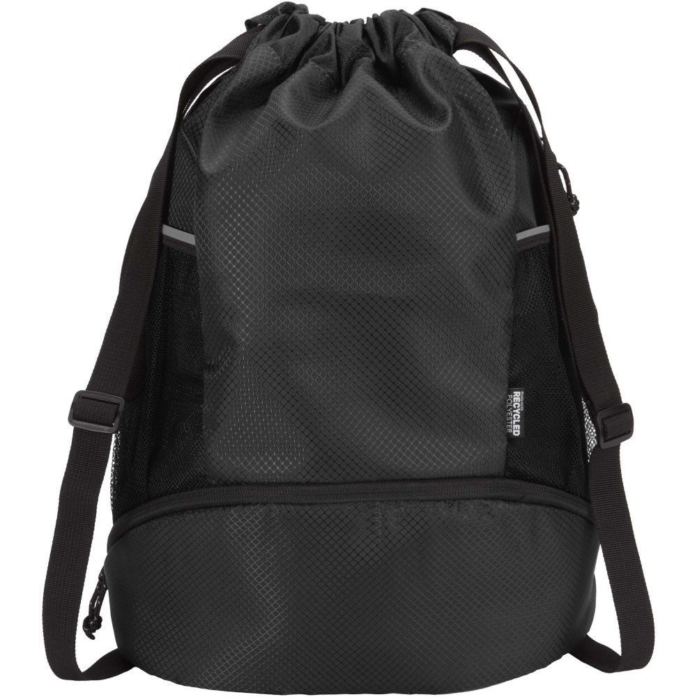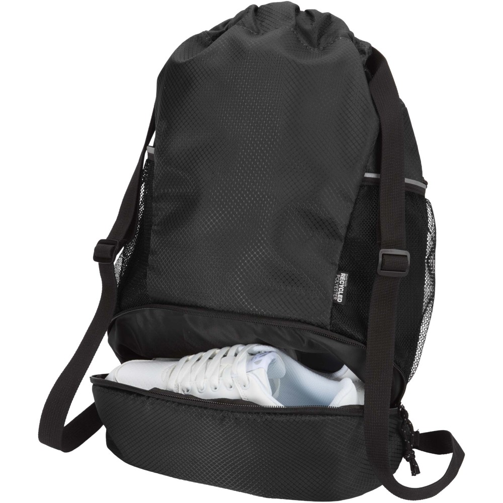 A Nomad sport húzózsinóros táska GRS tanúsítvánnyal rendelkező, újrahasznosított ripstop anyagból készült, vízlepergető felülettel, GRS tanúsítvánnyal rendelkező RPET béléssel és fényvisszaverő elemekkel. Aktív életmódot folytatók számára tervezték, ideális a mindennapi edzéshez és sporttevékenységekhez. Tágas fő rekesze: elfér benne ruházat, törölköző vagy akár egy kosárlabda is. Külön alsó rekesze biztosítja a cipők vagy használt ruhák elkülönített tárolását. Két oldalsó hálós zsebbel rendelkezik fényvisszaverő részletekkel, egy rejtett cipzáras zsebbel az értékek számára, valamint állítható hevederpántokkal a kényelmes hordozás érdekében. Emblémázás: Szitanyomás