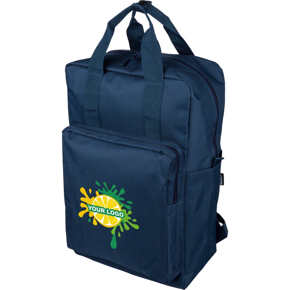 Újrahasznosított 900D poliészterből készült hátizsák, 210D béléssel és rPET címkével. Tágas fő rekesszel rendelkezik, 16?-os laptop számára kialakított külön zsebbel, elülső rekesszel, két oldalzsebbel, valamint bőröndre rögzíthető pánttal (trolley strap). Felső fogantyúi gombbal összefoghatóak, vállpántjai szellőző kialakításúak a kényelmes viselet érdekében. Emblémázás: Szitanyomás