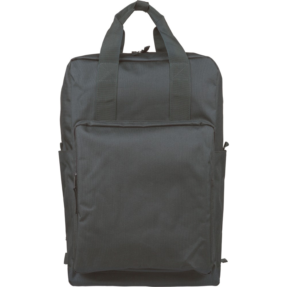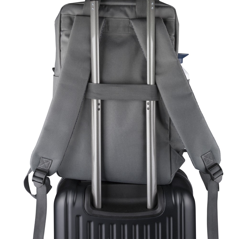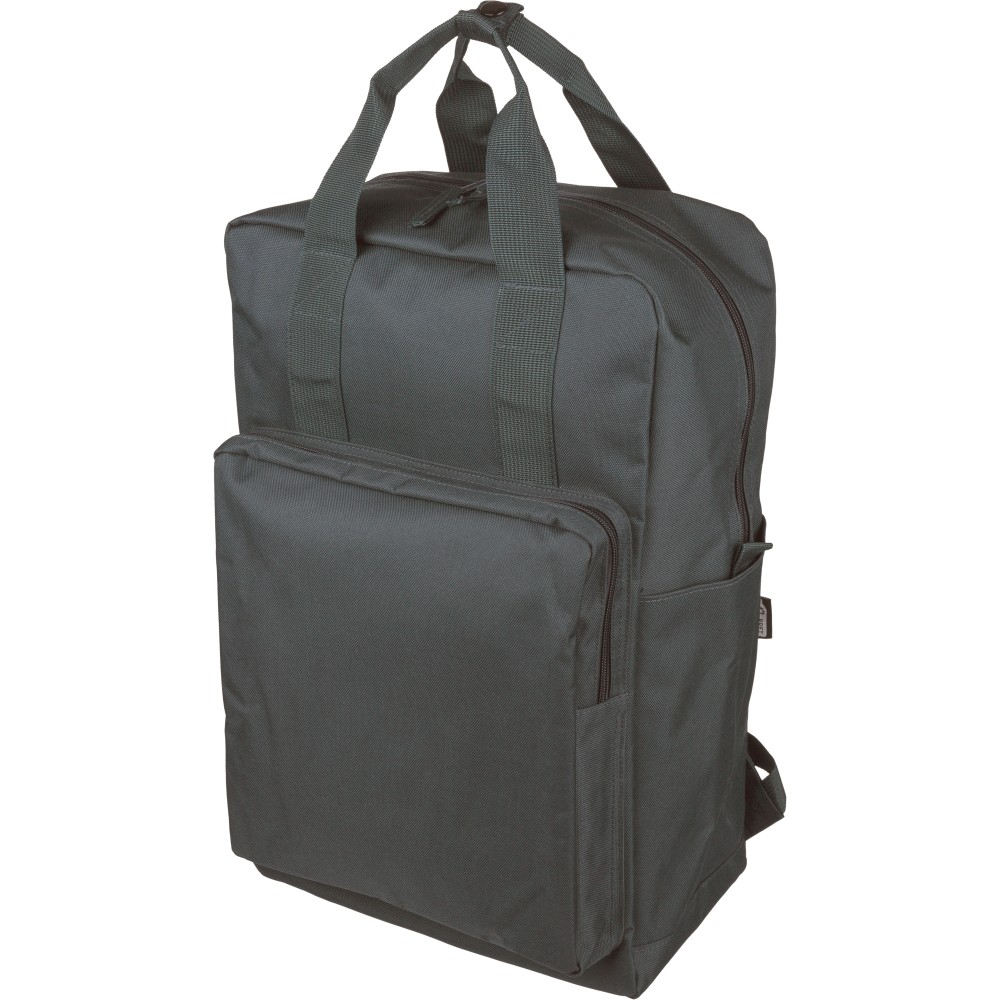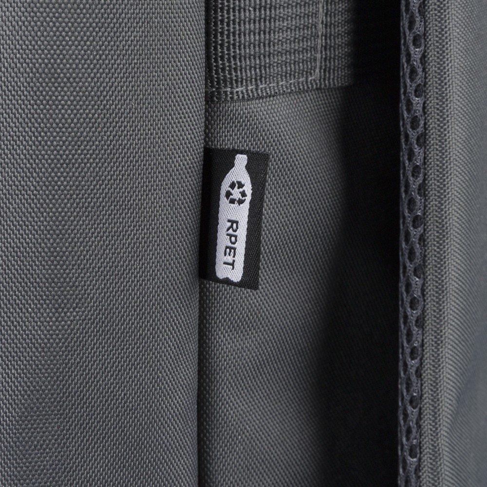 Újrahasznosított 900D poliészterből készült hátizsák, 210D béléssel és rPET címkével. Tágas fő rekesszel rendelkezik, 16?-os laptop számára kialakított külön zsebbel, elülső rekesszel, két oldalzsebbel, valamint bőröndre rögzíthető pánttal (trolley strap). Felső fogantyúi gombbal összefoghatóak, vállpántjai szellőző kialakításúak a kényelmes viselet érdekében. Emblémázás: Szitanyomás
