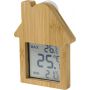 Ház alakú bambusz időjárásjelző állomás. Tapadókoronggal a hátoldalon. Funkciók: aktuális hőmérséklet, minimum hőmérséklet és maximum hőmérséklet. Elemeket tartalmaz. Egyenként csomagolva barna kartondobozban. Emblémázás: Gravírozás, Tamponnyomás