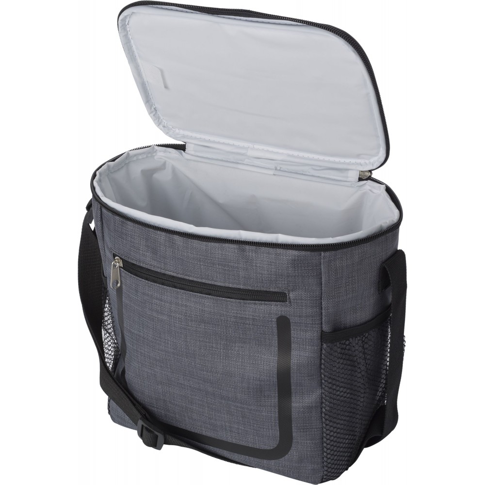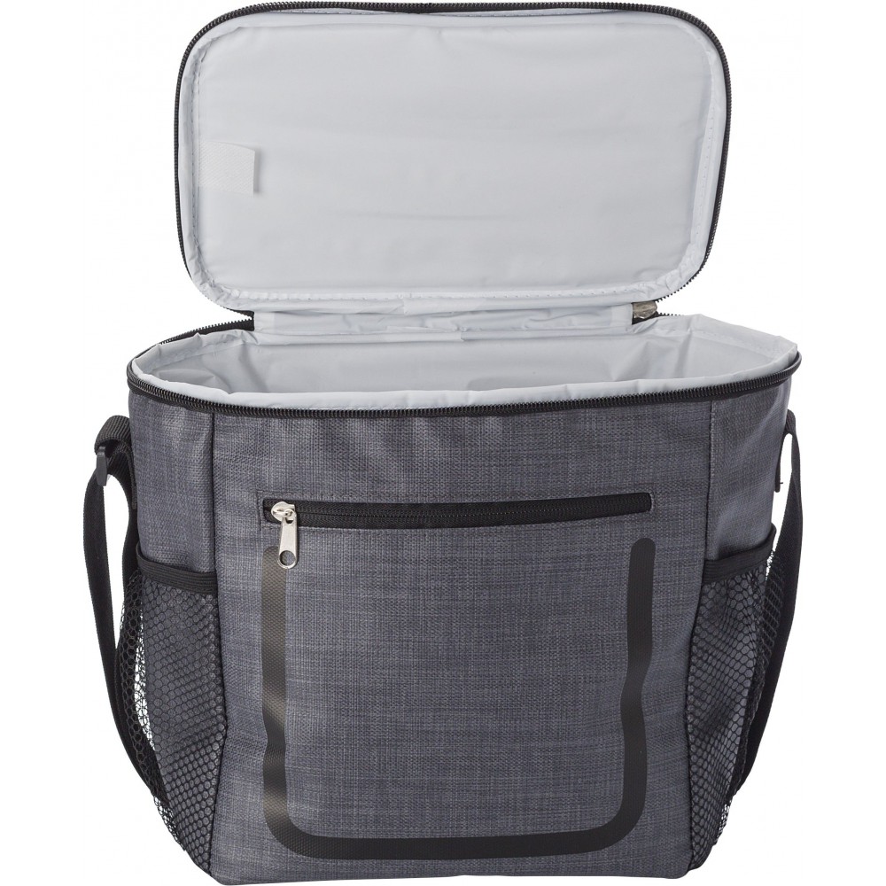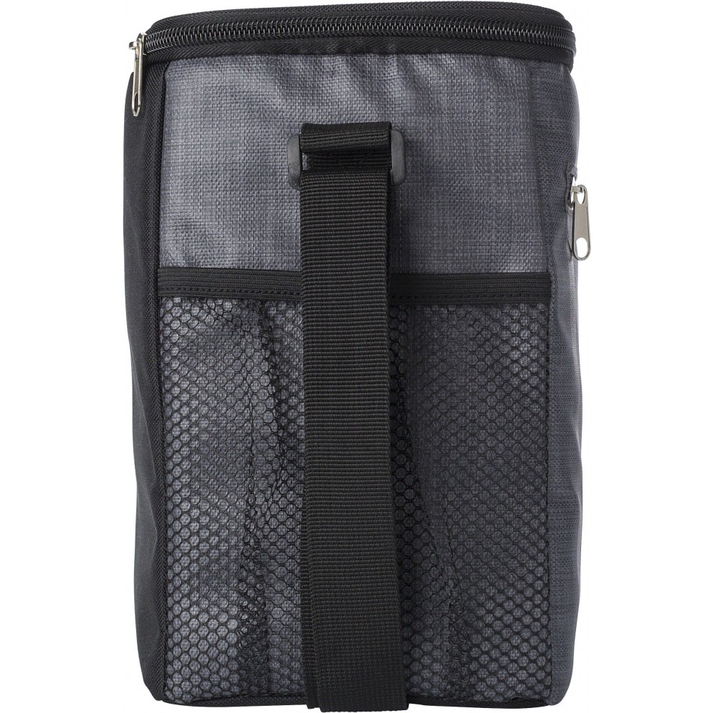Hűtőtáska cipzáras elsőzsebbel és hálós oldalsó rekeszekkel. A belső rész fehér szigetelő fóliával van bélelve. A táska állítható vállpánttal rendelkezik. PE, PU műanyag. Emblémázás: Szitanyomás