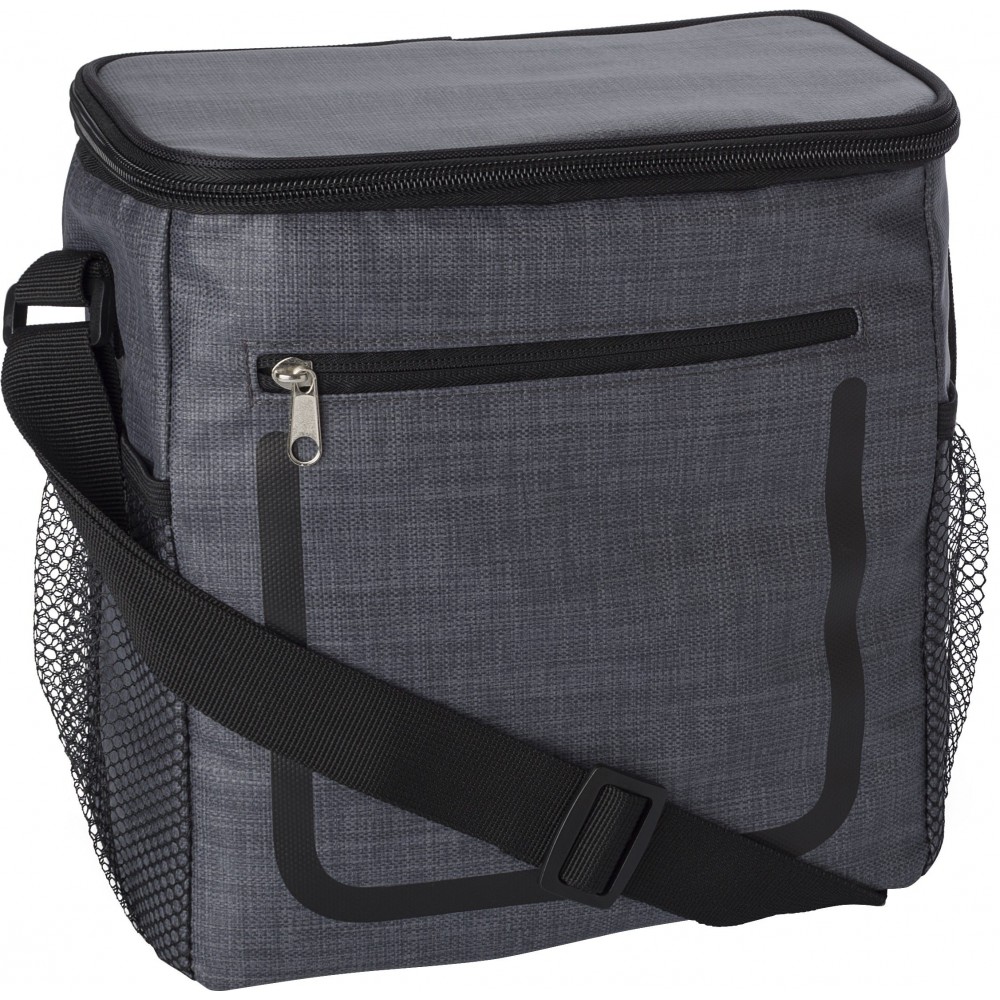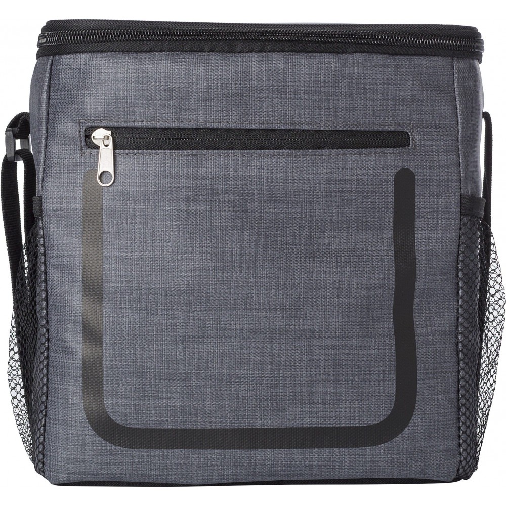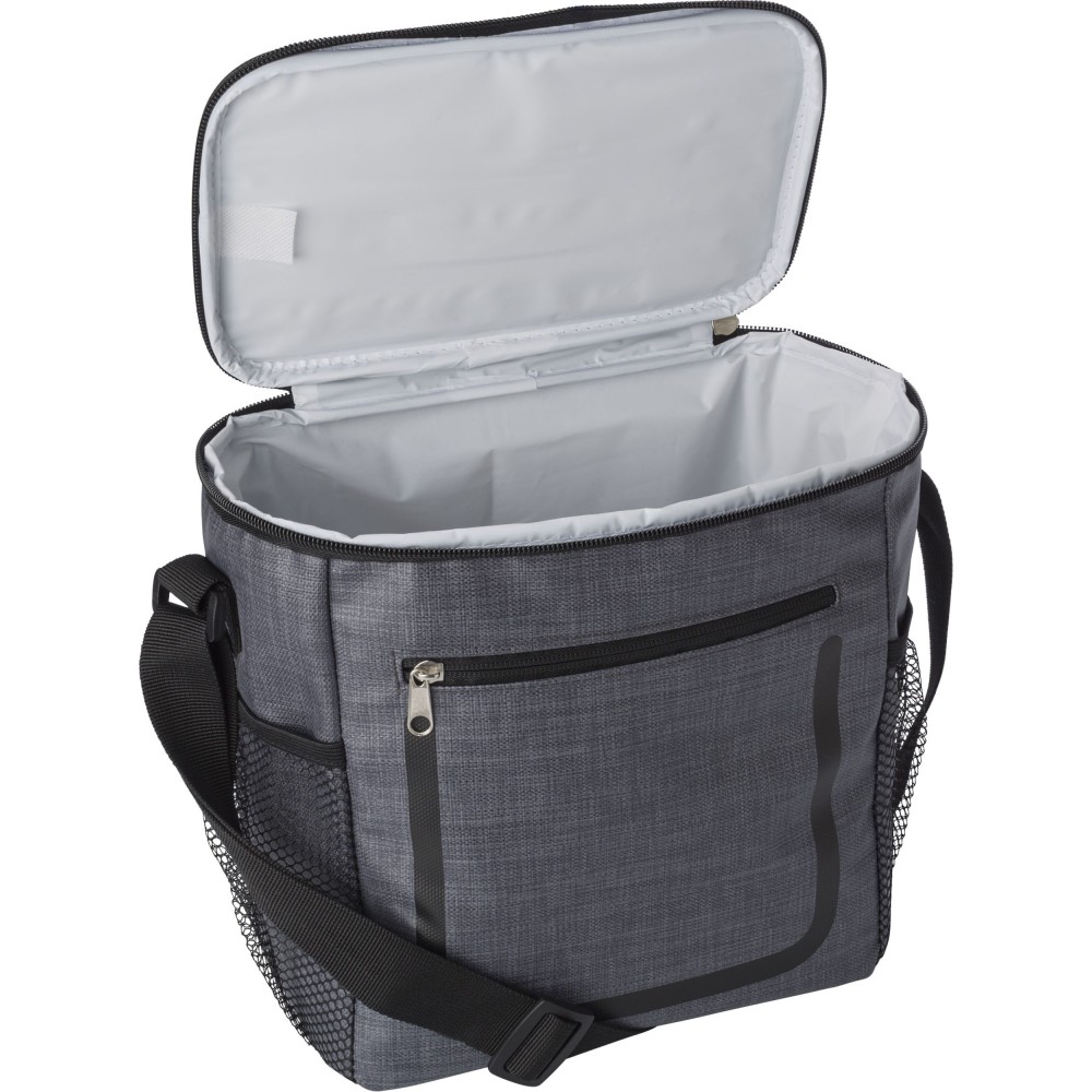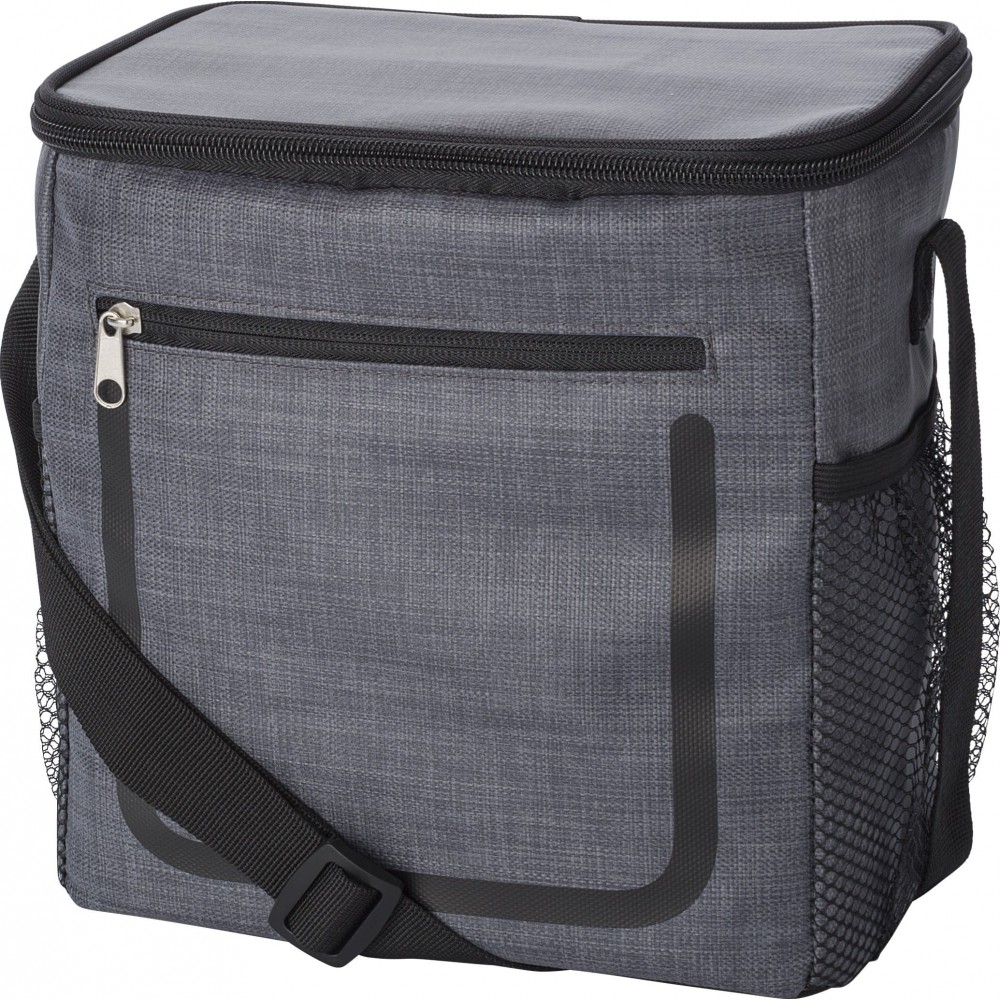 Hűtőtáska cipzáras elsőzsebbel és hálós oldalsó rekeszekkel. A belső rész fehér szigetelő fóliával van bélelve. A táska állítható vállpánttal rendelkezik. PE, PU műanyag. Emblémázás: Szitanyomás