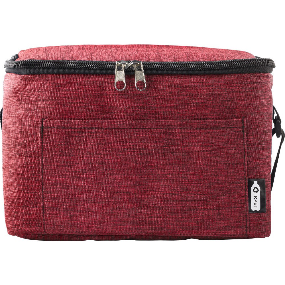 Hűtőtáska hat darab 330 ml-es üdítősdoboz számára. Cipzárral, első zsebbel és állítható pánttal. Űrtartalom: 3 liter. Poliészter (600D) és RPET anyag PEVA belsővel. Emblémázás: Szitanyomás