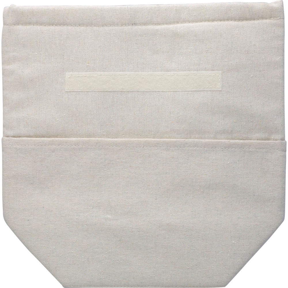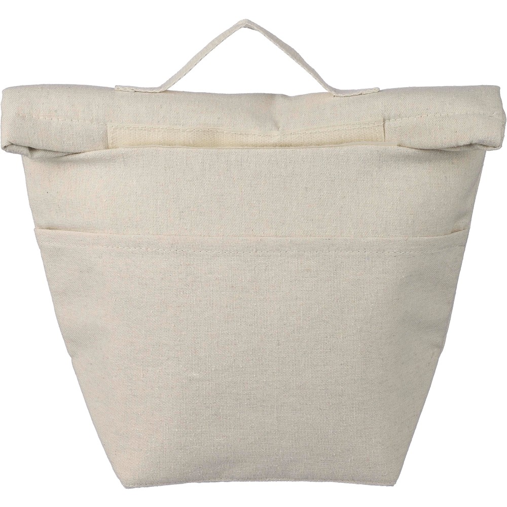 Feltekerhető hűtőtáska, belsejében 3 mm EPE és 12C PEVA béléssel. Tépőzáras záródással, egy kis elülső zsebbel és rövid hordozópánttal a tetején. Az oldalon újrahasznosított pamut anyagra utaló címkével. Újrahasznosított pamut 220 g/m2. Emblémázás: Hímzés