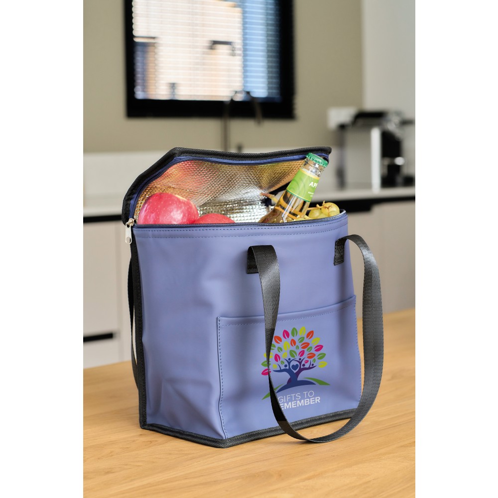 Újrahasznosított PU anyagból készült hűtőtáska 9 literes űrtartalommal, 210D újrahasznosított poliészter béléssel. 2,5 × 66 cm méretű hosszú fülekkel és elülső tárolózsebbel rendelkezik. A belső címkén újrahasznosított alapanyagra utaló logó található. Emblémázás: Szitanyomás