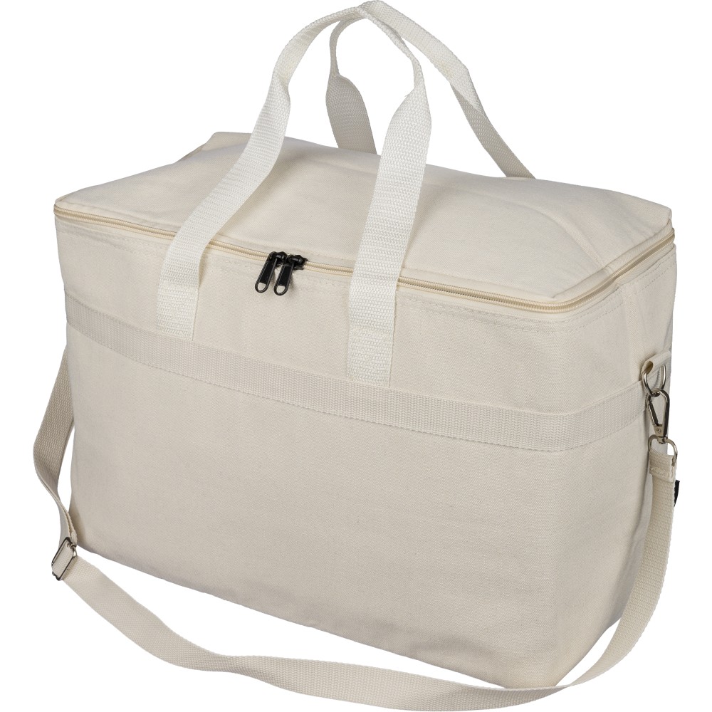 Újrahasznosított pamut-poliészter 330 g/m2 kevertszövetből készült hűtőtáska alumíniumfóliás szigeteléssel, 23 literes űrtartalommal. 60 cm hosszúságú és 3,5 cm szélességű fülekkel, 110 cm hosszúságú és 2,5 cm szélességű állítható vállpánttal, fémcsattal és a táska színével megegyező hevederrel rendelkezik. Külső felületén rPET címkével, belső részében további címkével ellátva. Emblémázás: Szitanyomás