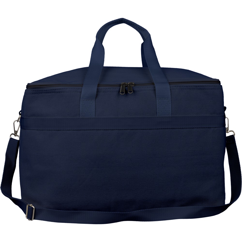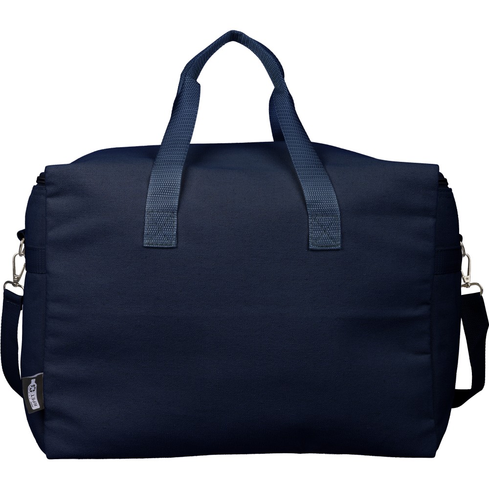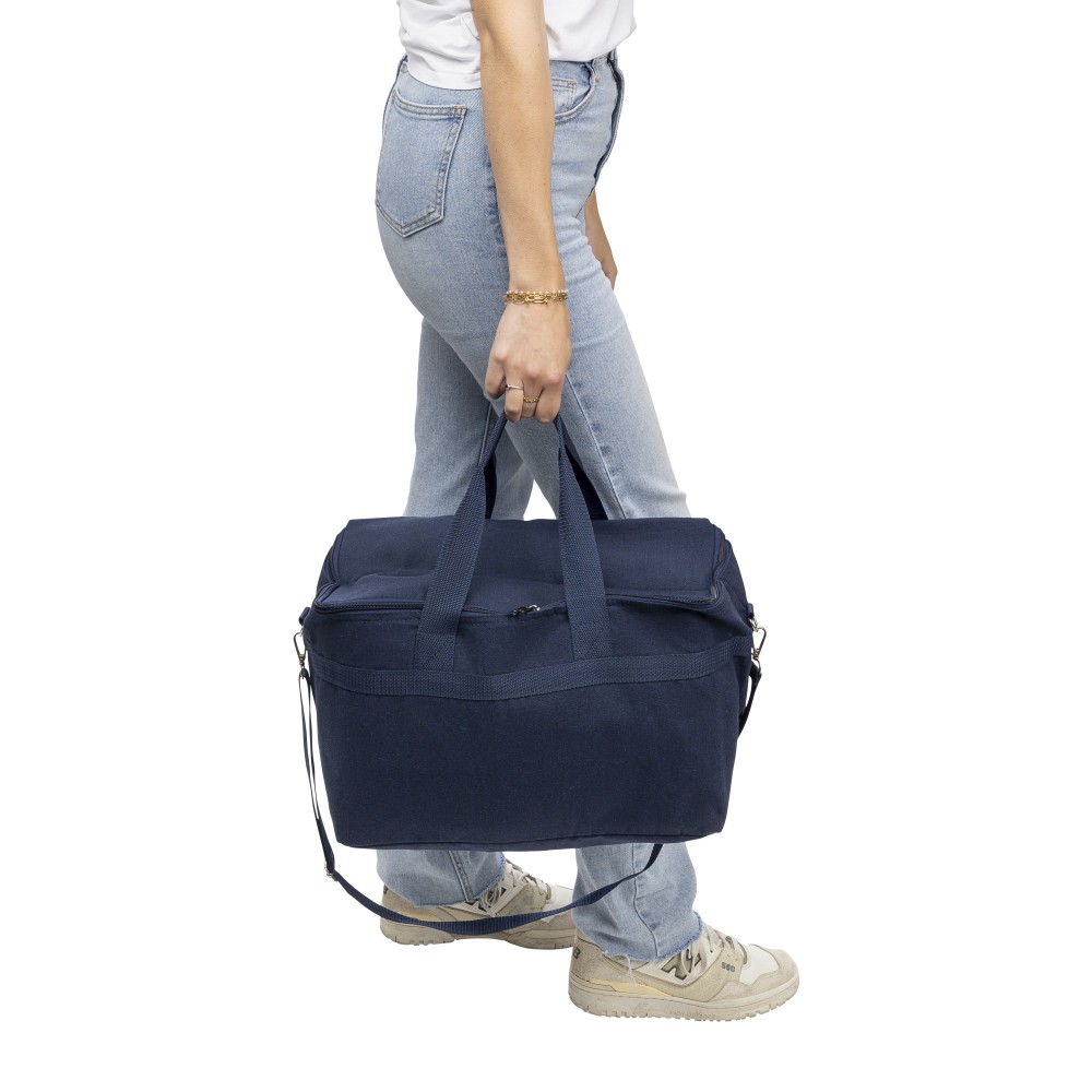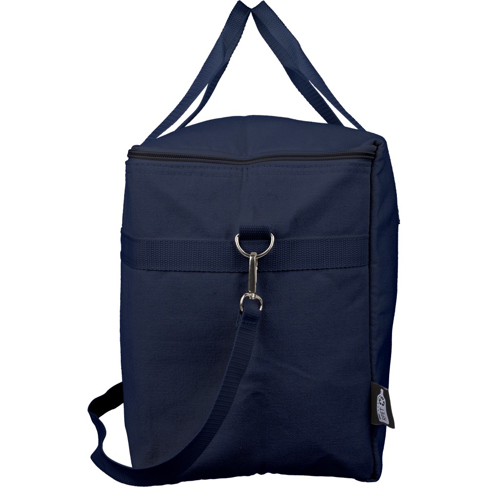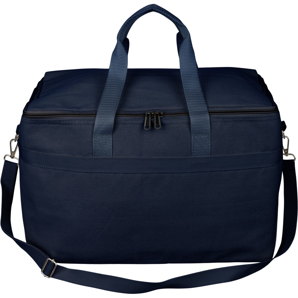 Újrahasznosított pamut-poliészter 330 g/m2 kevertszövetből készült hűtőtáska alumíniumfóliás szigeteléssel, 23 literes űrtartalommal. 60 cm hosszúságú és 3,5 cm szélességű fülekkel, 110 cm hosszúságú és 2,5 cm szélességű állítható vállpánttal, fémcsattal és a táska színével megegyező hevederrel rendelkezik. Külső felületén rPET címkével, belső részében további címkével ellátva. Emblémázás: Szitanyomás