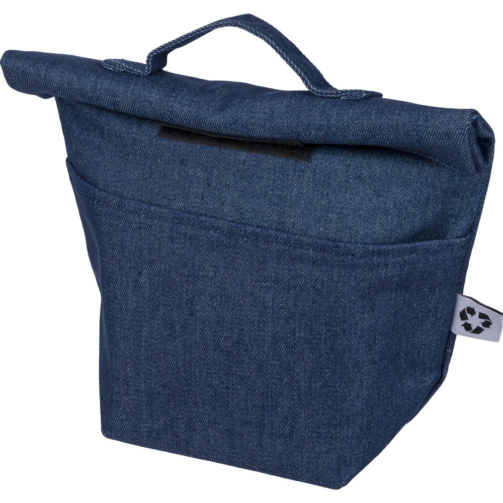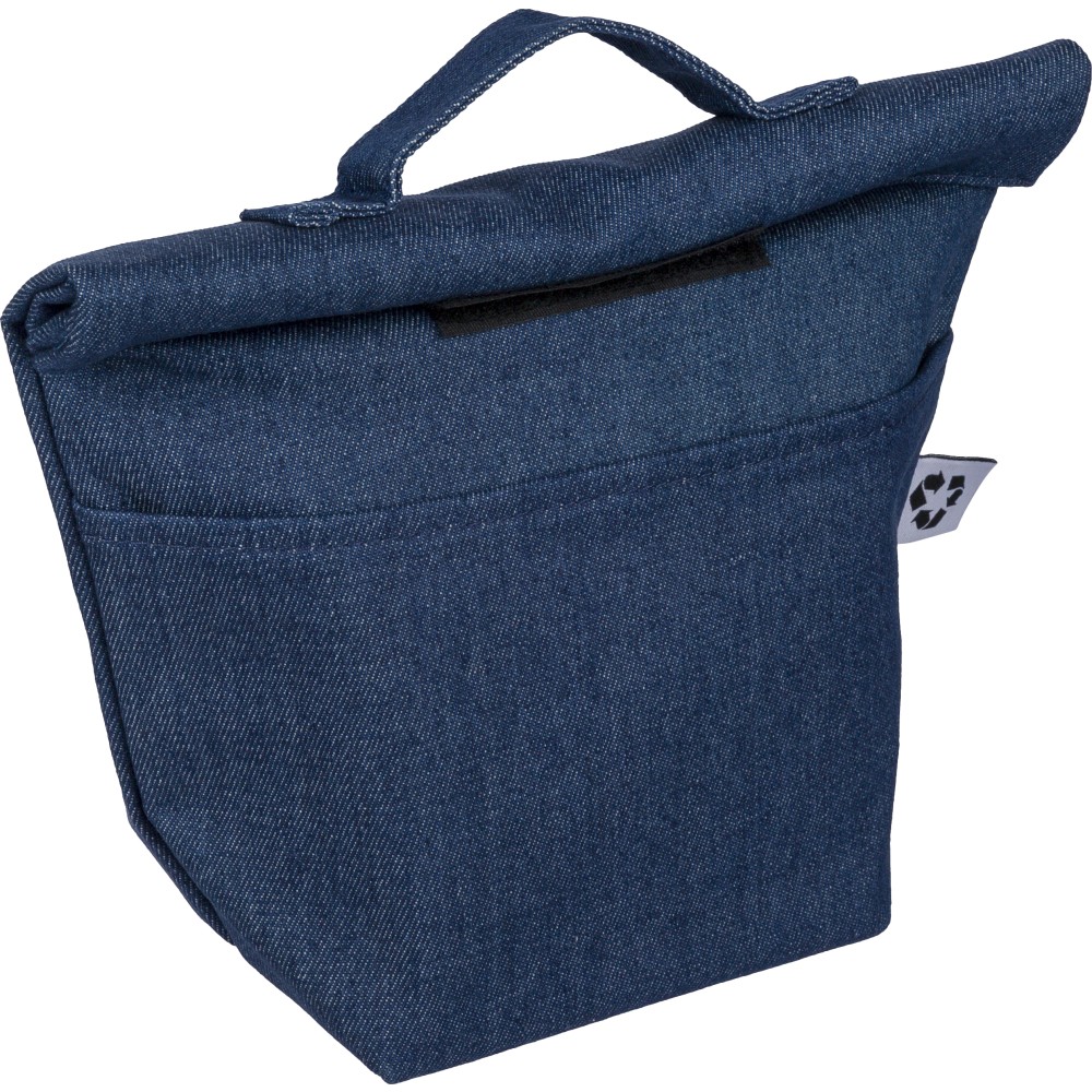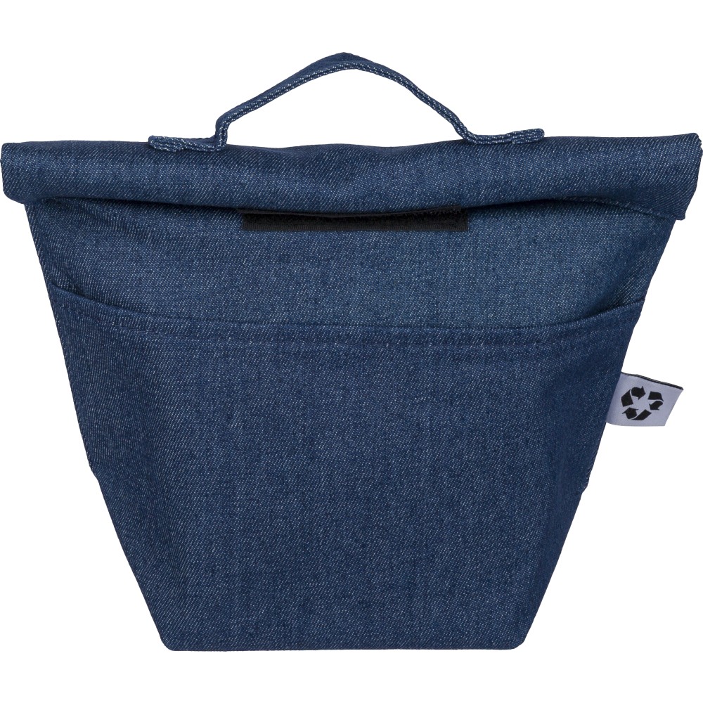 Újrahasznosított farmeranyagból készült, 27 × 10 × 31 cm méretű roll-top kialakítású hűtőtáska tépőzáras záródással, PEVA belső réteggel és rövid fogantyúval. Elülső zsebbel és a külső felületen elhelyezett újrahasznosított alapanyagra utaló címkével ellátva. Emblémázás: Szitanyomás
