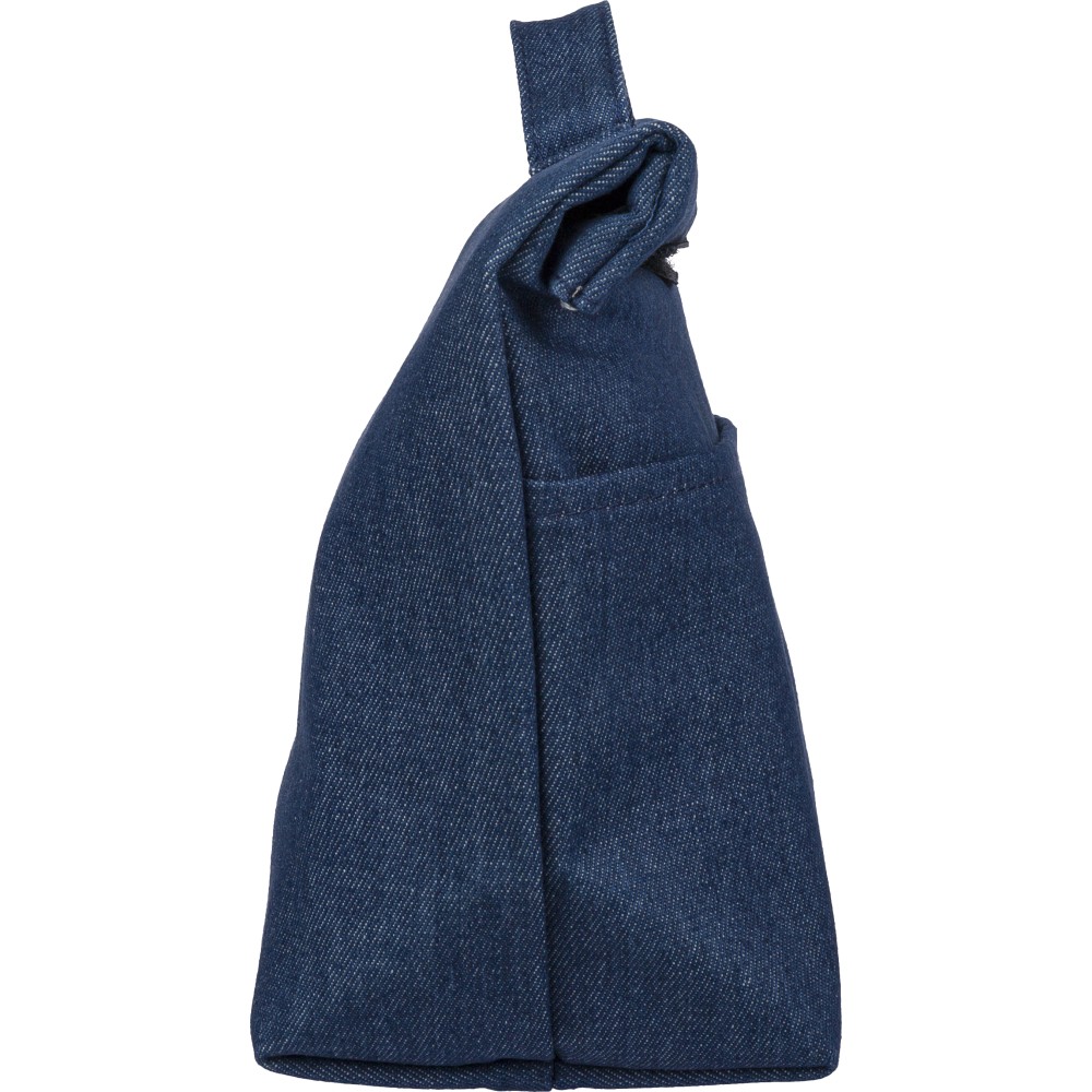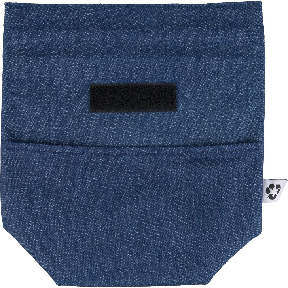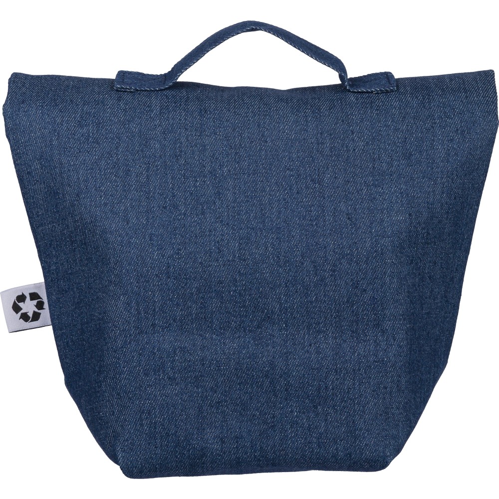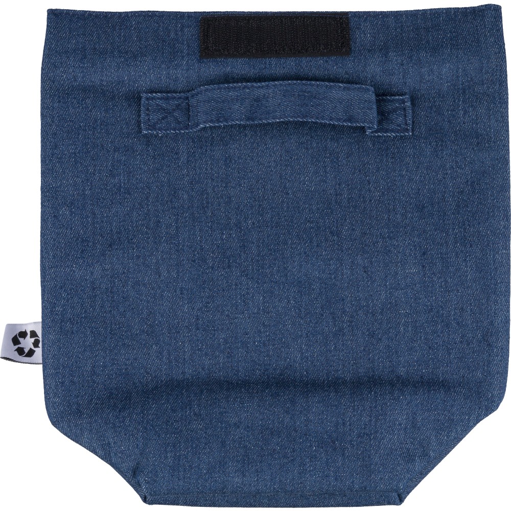 Újrahasznosított farmeranyagból készült, 27 × 10 × 31 cm méretű roll-top kialakítású hűtőtáska tépőzáras záródással, PEVA belső réteggel és rövid fogantyúval. Elülső zsebbel és a külső felületen elhelyezett újrahasznosított alapanyagra utaló címkével ellátva. Emblémázás: Szitanyomás