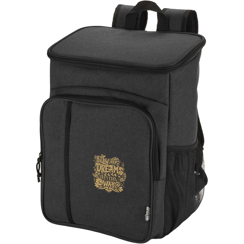 A Tundra piknik hűtőhátizsák GRS tanúsítvánnyal rendelkező újrahasznosított anyagokból készült, és egy kétszemélyes, élelmiszerbiztonsági szempontból tesztelt műanyagból készült, többször használható evőeszközkészletet is tartalmaz. A szivárgásmentes főrekesz nagy sűrűségű habszigeteléssel és hegesztett PEVA béléssel biztosítja az ételek és italok hűtését órákon át. A praktikus kialakítás érdekében a termék két oldalsó hálós zsebbel, egy evőeszközökkel (két kés, két villa, két pohár és két tányér) felszerelt cipzáras elülső zsebbel, valamint egy felső kiegészítő cipzáras zsebbel rendelkezik. A 20 literes űrtartalmú hátizsák a párnázott, állítható vállpántok és a stabil hevederes hordfül segítségével kényelmesen szállítható, így ideális kiegészítő piknikezéshez, szabadtéri étkezésekhez, kempingezéshez vagy strandoláshoz. Emblémázás: Szitanyomás