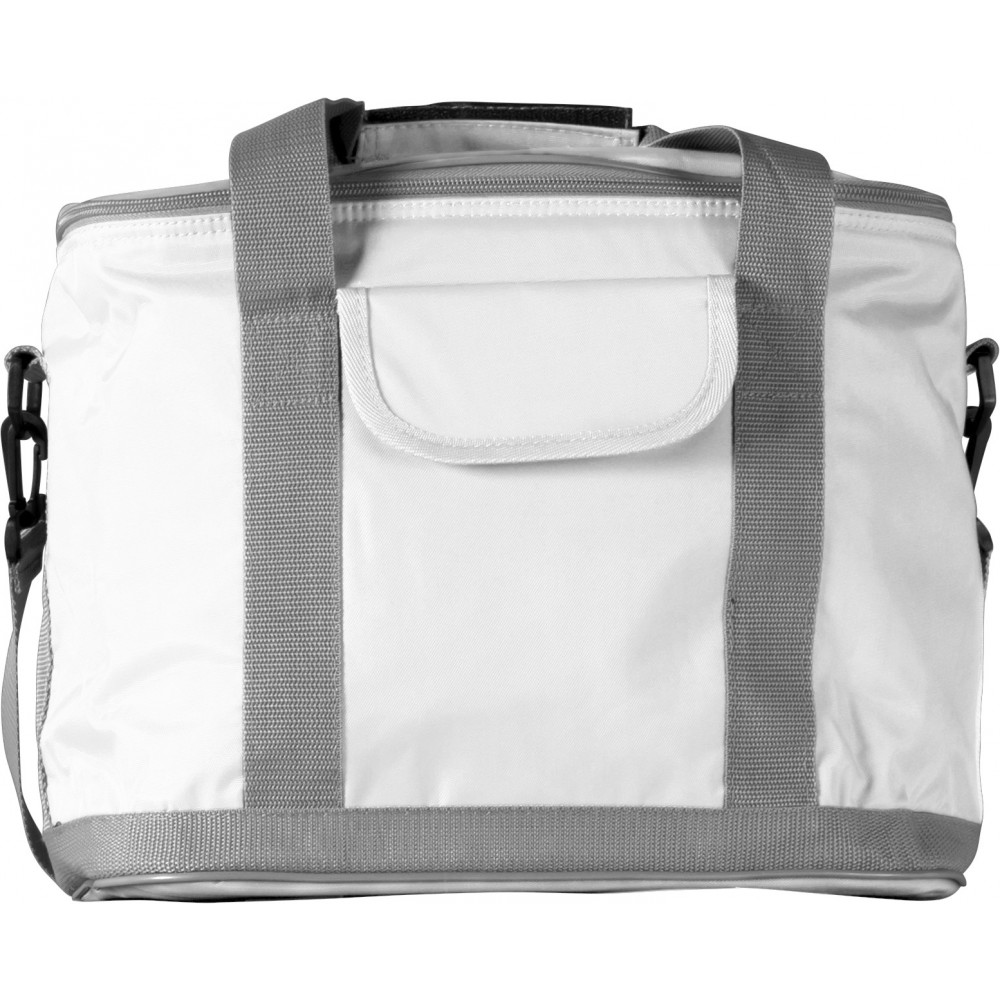 Hűtőtáska külső zsebbel, állítható vállpánttal. 420D nylon. Emblémázás: Szitanyomás