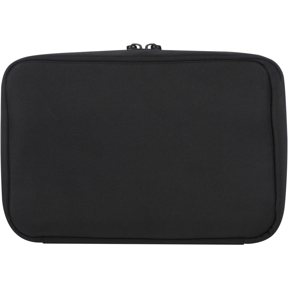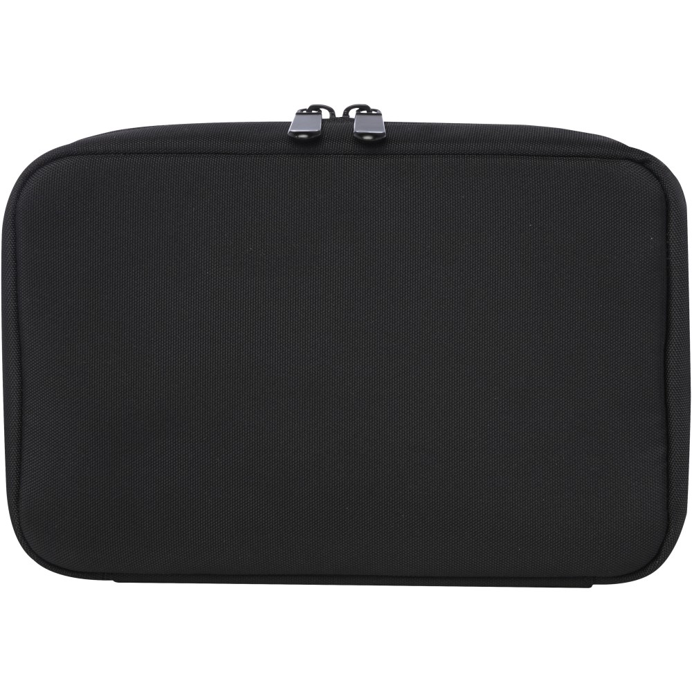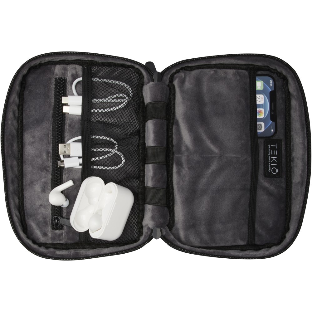 A Rise szervezőtáska sokoldalú és hibrid megoldás a műszaki cikkek rendszerezésére. Ez a tartós 900D GRS újrahasznosított poliészterből és GRS újrahasznosított velúr/bársony béléssel készült keményfedelű tok két lapos tokkal, hálós zsebekkel, alul elasztikus pántokkal a kábelek számára, valamint egy cipzáras zsebbel rendelkezik a további kiegészítők számára. Az összes zseb optimális szervezést biztosít, a kemény héj megvédi az összes értékes kütyüt. Emblémázás: Szitanyomás