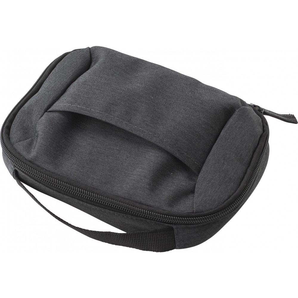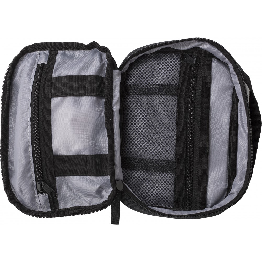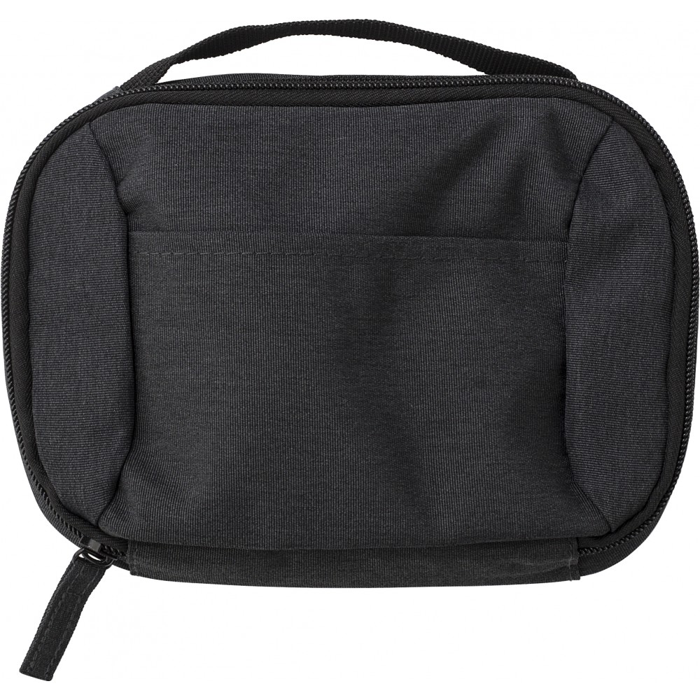 Kistáska utazáshoz, 600D poliészter anyagból. Több kisebb tartózseb kábelek, utazási dokumentumok tárolására. Elöl egy nyitott zseb. Emblémázás: Szitanyomás