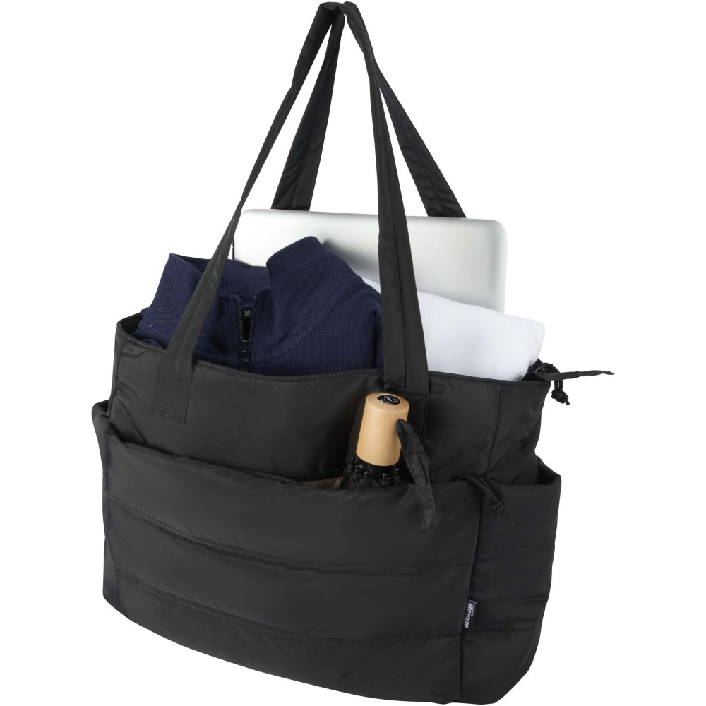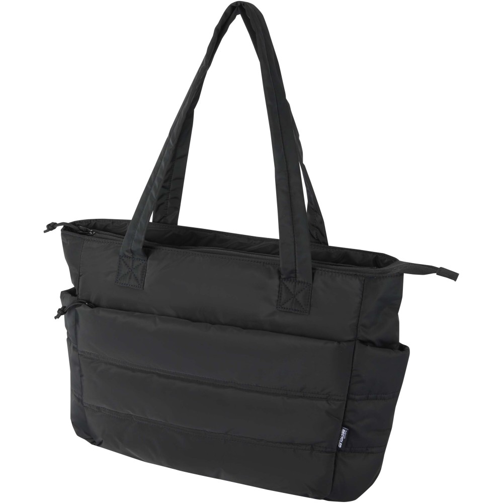 A Puffer 15,6" laptop válltáska GRS tanúsítvánnyal rendelkező újrahasznosított alapanyagokat ötvöz letisztult, modern megjelenéssel. A 18 literes űrtartalom mellett párnázott laptoprekesszel rendelkezik, amely legfeljebb 15,6 colos eszközök biztonságos tárolására alkalmas, valamint több belső és külső zsebbel, amelyekben kényelmesen elférnek jegyzetfüzetek, töltők, kulacs és egyéb mindennapi kiegészítők. A hosszú, párnázott fülek és a bőröndre rögzíthető pánt komfortos hordozást biztosítanak, míg a puffer stílusú párnázás egyszerre gondoskodik a védelemről és az elegáns megjelenésről. Könnyű és vízlepergető kialakításának köszönhetően ideális választás úton lévő szakemberek és diákok számára. Emblémázás: Szitanyomás