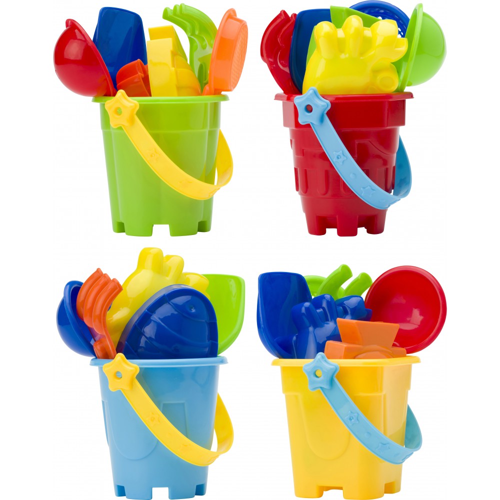 A véletlenszerű színű vödör tartalma: egy lapát, két ásó, egy szita és két homokozóforma (hal és rák alakúak). A vödör színe nem választható. BPA-mentes műanyag. Emblémázás: Matricázás