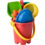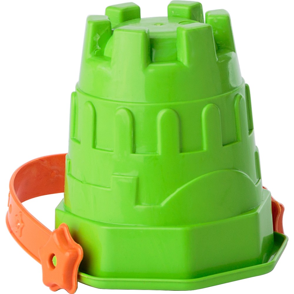 Újrahasznosított PP homokozóvödör (4 színben vegyesen). Minden vödör tartalmaz lapátot, gereblyét, kanalat, szitát és két homokozóformát. Egyenként hálóba csomagolva, kartonkártyával együtt érkezik. Emblémázás: Matricázás