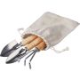 Kerti szerszámkészlet, amely két különböző lapátot és egy gereblyét tartalmaz. Az eszközök rozsdamentes acélból készültek, a nyelek fából. Egyenként pamut zsinóros tasakba csomagolva. Anyaga: rozsdamentes acél és fa. Emblémázás: Gravírozás, Szitanyomás