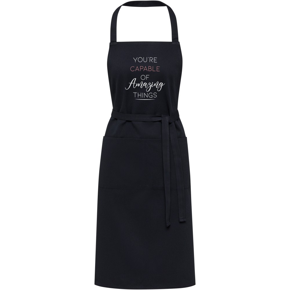 A Shara kötény 70% újrahasznosított pamutból és 30% újrahasznosított poliészterből készült, így vastag, strapabíró és kényelmes viselet. A kötény 2 egymás melletti zsebbel (egyenként 22 x 20 cm) és egy 1 méteres megkötővel rendelkezik. A kötény Cyclo újrahasznosított szálakat tartalmaz, ahol előválogatott hulladékot használnak, amely meghatározza a fonal színét. Minden kötényhez egy Aware nyomjelző is tartozik. Ez az innovatív funkció lehetővé teszi a felhasználók számára, hogy egy QR-kód segítségével nyomon követhessék a termék eredetét és útját, növelve az ellátási lánc átláthatóságát és elősegítve a termék és a gyártási folyamat közötti szorosabb kapcsolatot. Emblémázás: Hímzés, Szitanyomás