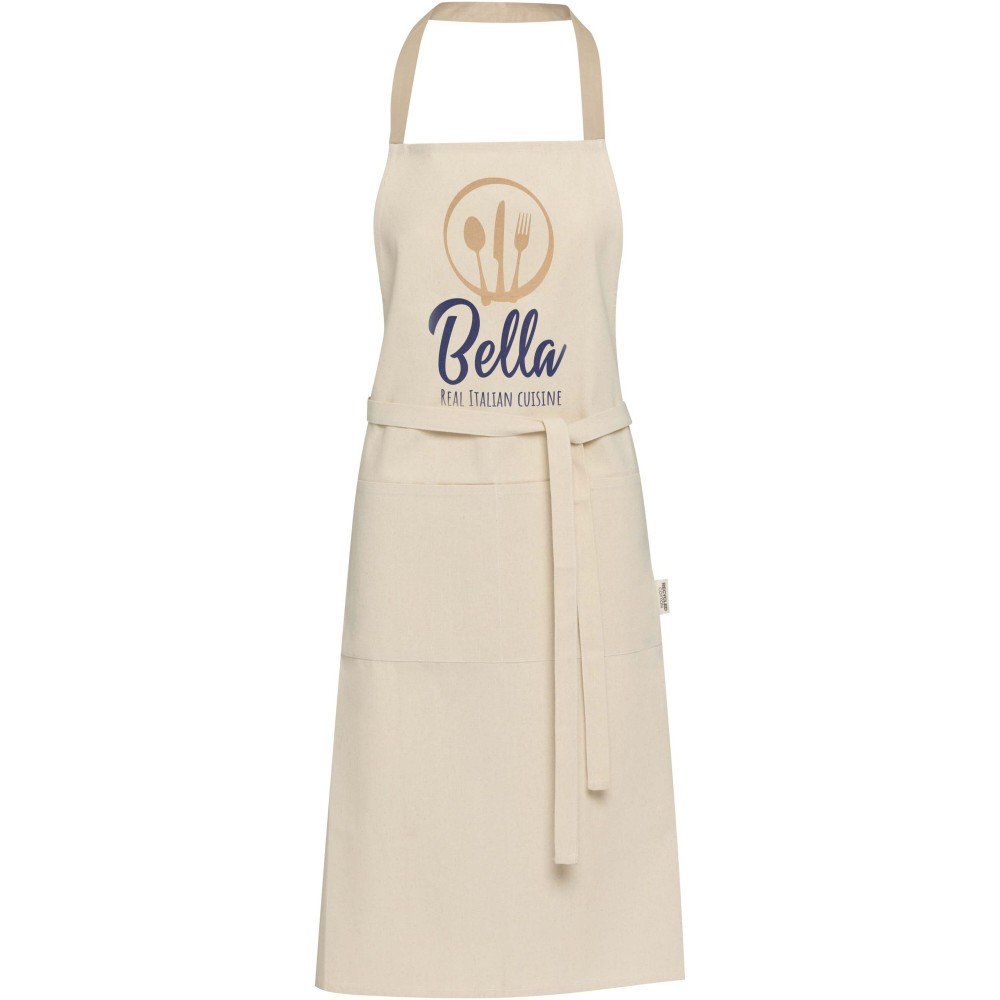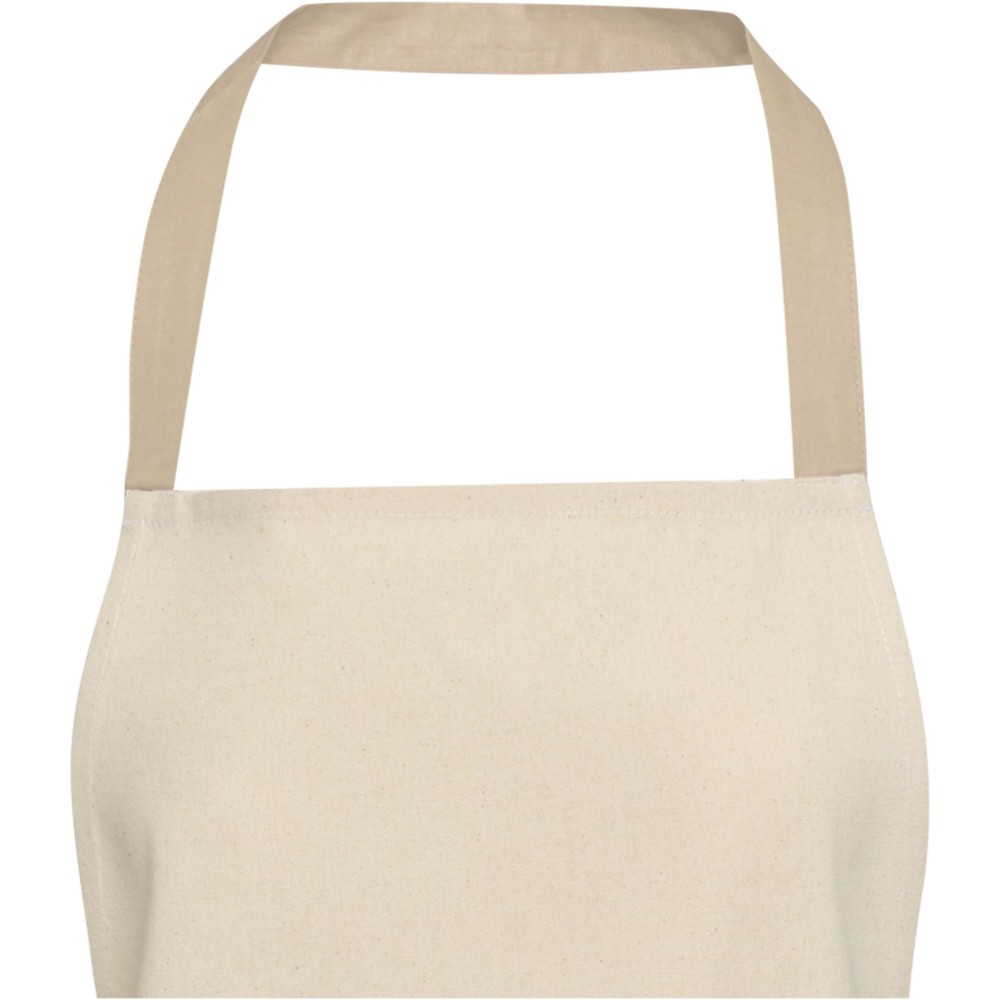 A Nia kötény 100% GRS tanúsítvánnyal rendelkező, 200 g/m2 újrahasznosított pamutból készült. Természetes pamut színe és kontrasztos nyakkpántja elegánsan védi ruhádat főzés közben. Két egymás melletti zsebbel rendelkezik, összesen 45 x 20 cm-es mérettel, és 1 méter hosszú pánttal rögzíthető hátul. Emblémázás: Hímzés, Szitanyomás