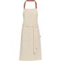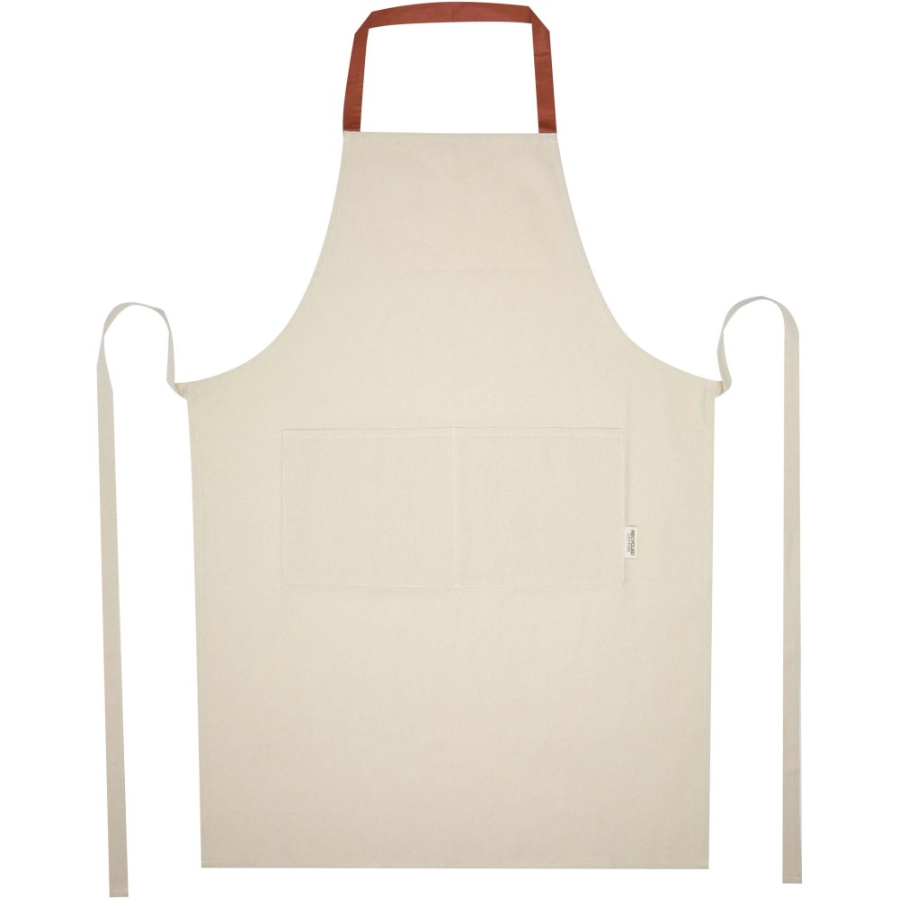 A Nia kötény 100% GRS tanúsítvánnyal rendelkező, 200 g/m2 újrahasznosított pamutból készült. Természetes pamut színe és kontrasztos nyakkpántja elegánsan védi ruhádat főzés közben. Két egymás melletti zsebbel rendelkezik, összesen 45 x 20 cm-es mérettel, és 1 méter hosszú pánttal rögzíthető hátul. Emblémázás: Hímzés, Szitanyomás