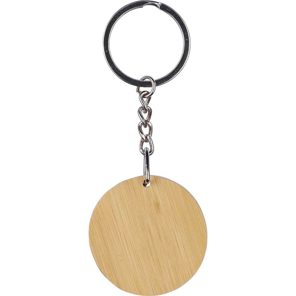Kulcstartó gumis felületű, rozsdamentes acél gravírozólappal. A gravírozás utáni szín fényes króm. Egyedi csomagolásban, barna kraftpapír tokban. Anyaga: bambusz. Emblémázás: Tamponnyomás