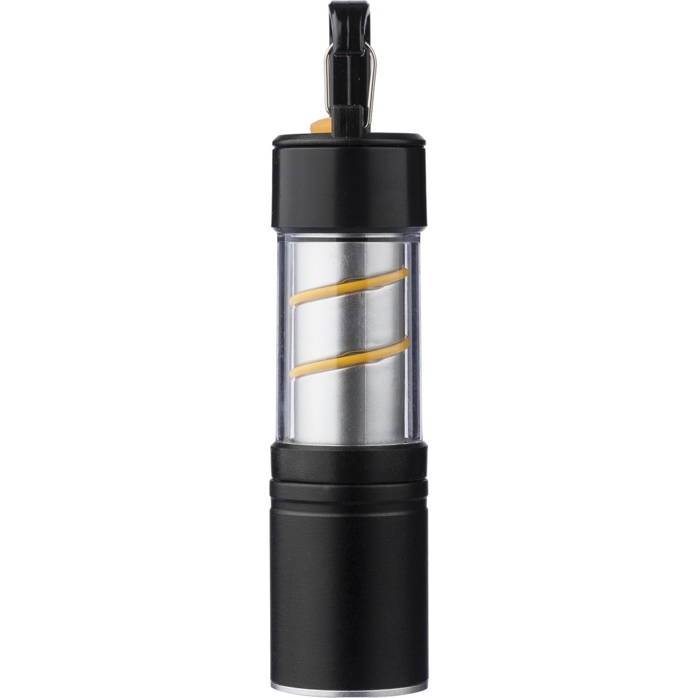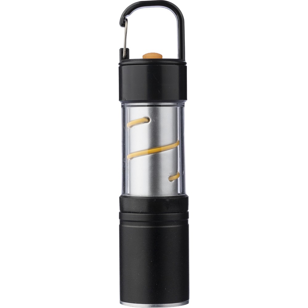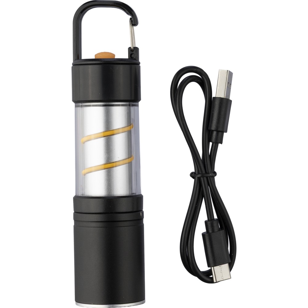 Alumínium és ötvözet COB zseblámpa ABS burkolattal, fém klipsszel és fekete karabinerrel. 3 világítási funkcióval, zoom móddal, nyomógombbal és mágneses talppal. 500 mAh-s lítium-ion akkumulátorral működik, C típusú töltéssel. 30 cm-es fekete kábellel. Egyenként csomagolva, barna kartondobozban. Emblémázás: Gravírozás, Tamponnyomás