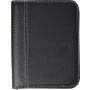 Cipzáros A5 irattartó PU borítással, fehér díszítő tűzésekkel, tolltartó hurokkal, hat különböző méretű zsebbel, 30 lapos, vonalas jegyzettömbbel, mikroszálas béléssel. A tollat nem tartalmazza. Emblémázás: Szitanyomás, Tamponnyomás