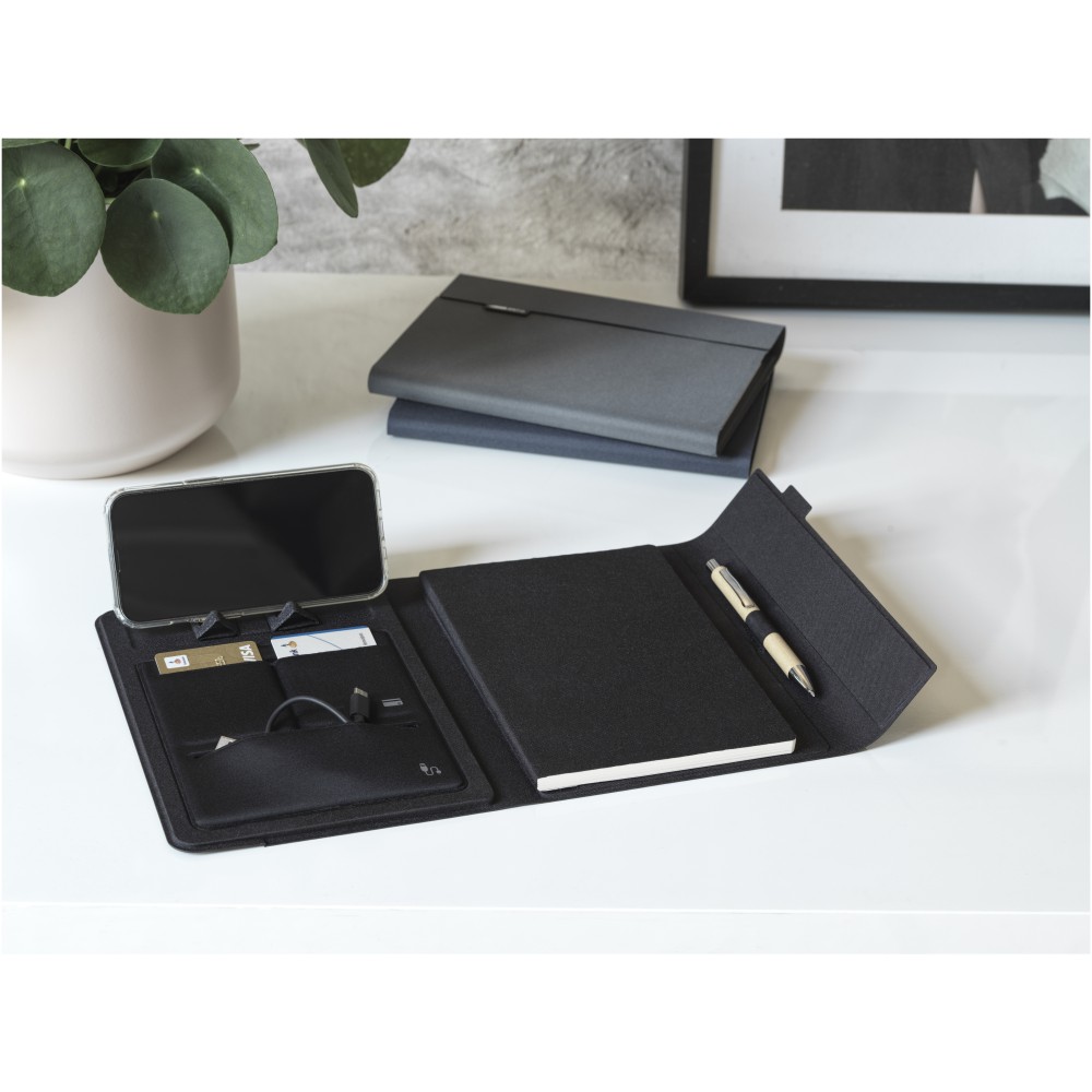 Az RCS tanúsítvánnyal rendelkező Liberto padfólió részben újrahasznosított poliészterből készül, így ez a padfólió fenntarthatóbb választás, mivel segít csökkenteni az új nyersanyag felhasználását. Tollhurokkal, harmonikazsebbel és 64 krémszínű, vonalas, fenntartható forrásból származó, 80 g/m2-es, újrahasznosított lappal rendelkezik. A képeken látható toll és egyéb kiegészítők nem tartoznak a termékhez. Emblémázás: Tamponnyomás