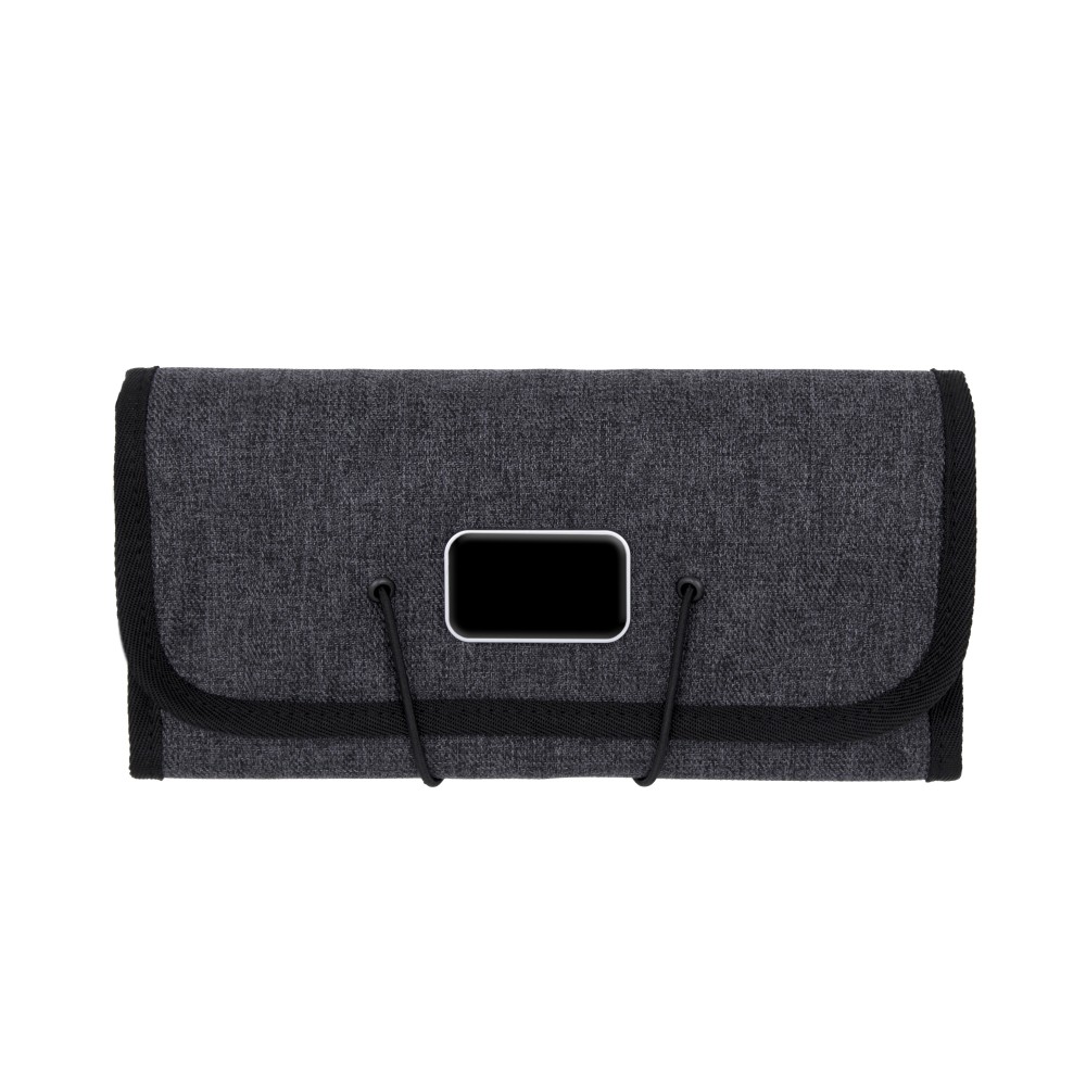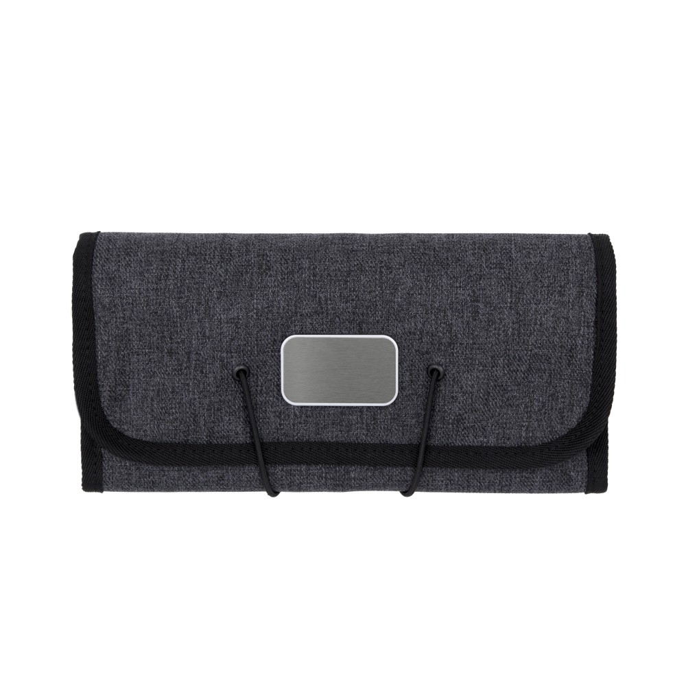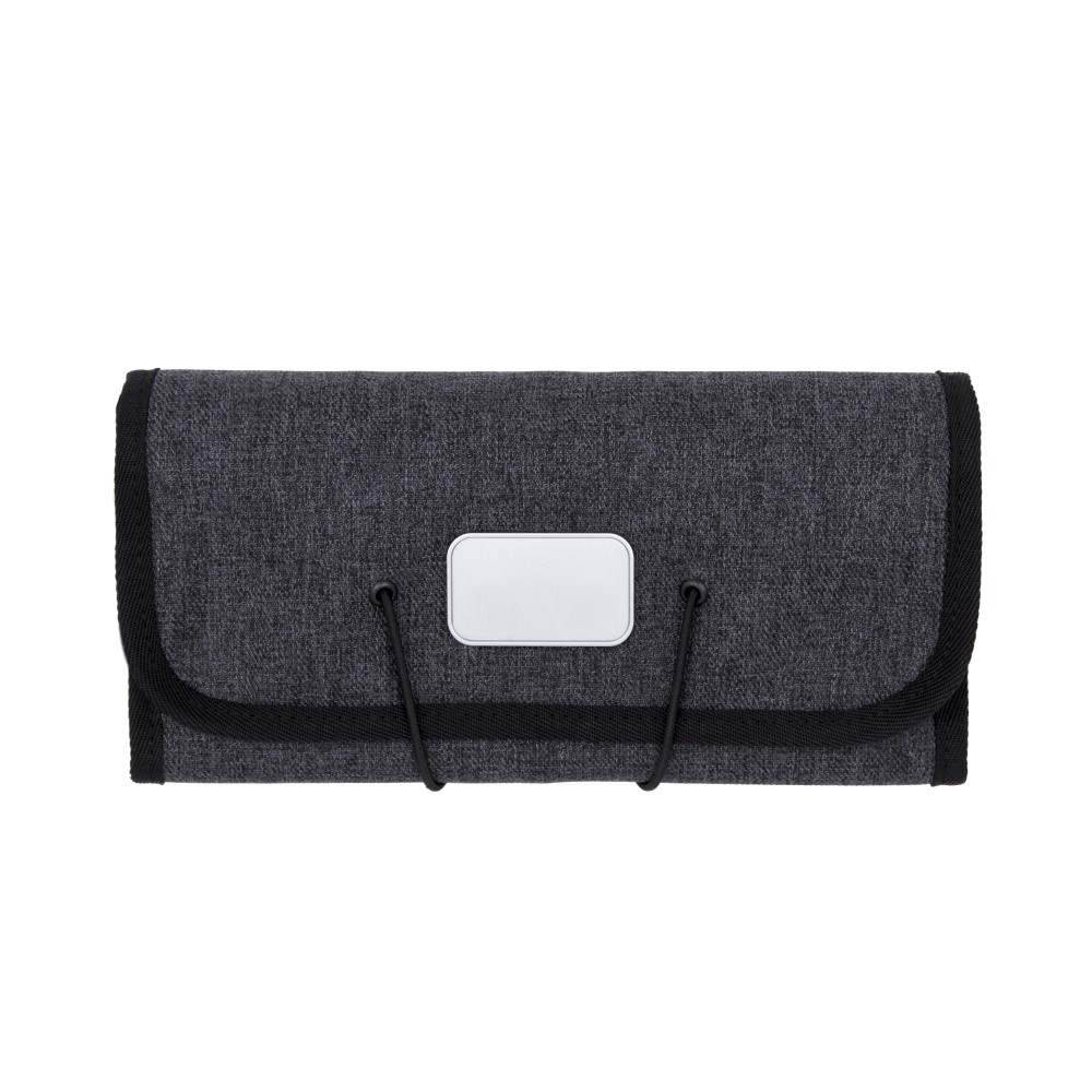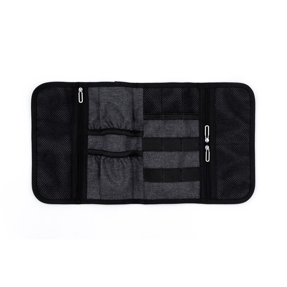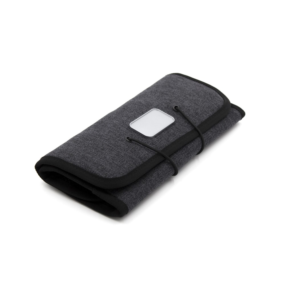 A Folio portfólió tökéletes társ a digitális eszközök és a mindennapi technikai eszközök rendszerezéséhez, miközben az utazási kiegészítők is elférnek benne. A prémium minőségű, víz- és folttaszító 600D poliészterből készült, kompakt kialakításának köszönhetően könnyen elfér a táskában, hátizsákban vagy bőröndben. A praktikus elrendezés 6 elasztikus hurkot tartalmaz a kábelek és eszközök számára, 3 hálós zsebet az olyan apróságok számára, mint az USB-k vagy SD-kártyák, valamint 2 nyitott zsebet a töltők vagy hálózati adapterek számára, így nagyfokú rugalmasságot és állítható belső tárolást kínál. Emblémázás: Gravírozás