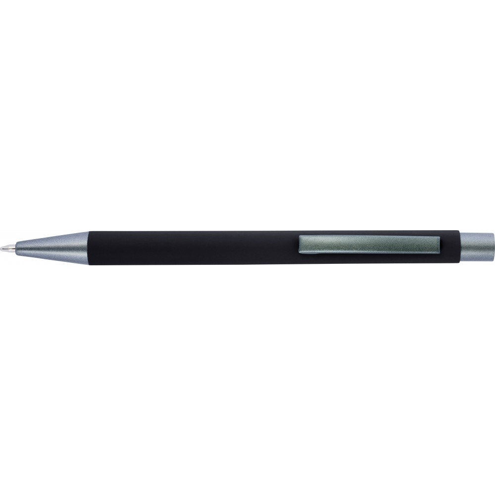 Golyóstoll gumis bevonattal, kék tollbetéttel. A hegy, klipsz és a nyomógomb egyforma sötétszürke színű. ABS, alumínium. Emblémázás: Gravírozás, UV nyomtatás