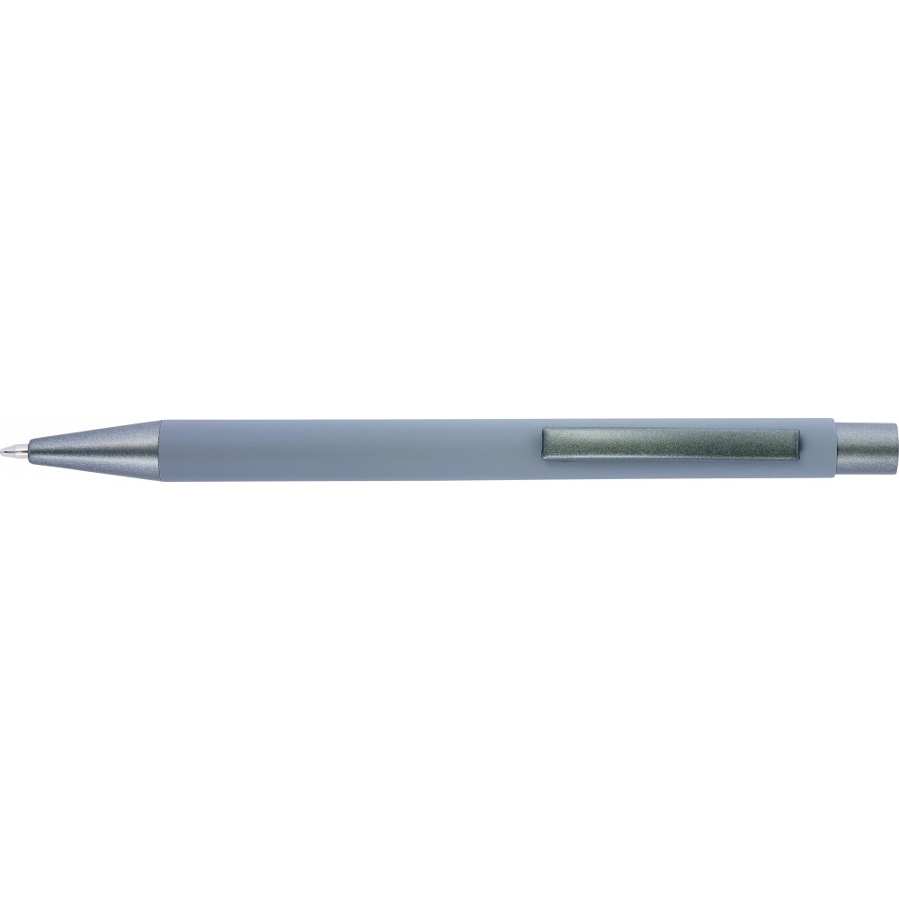 Golyóstoll gumis bevonattal, kék tollbetéttel. A hegy, klipsz és a nyomógomb egyforma sötétszürke színű. ABS, alumínium. Emblémázás: Gravírozás, UV nyomtatás