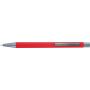 Golyóstoll gumis bevonattal, kék tollbetéttel. A hegy, klipsz és a nyomógomb egyforma sötétszürke színű. ABS, alumínium. Emblémázás: Gravírozás, UV nyomtatás