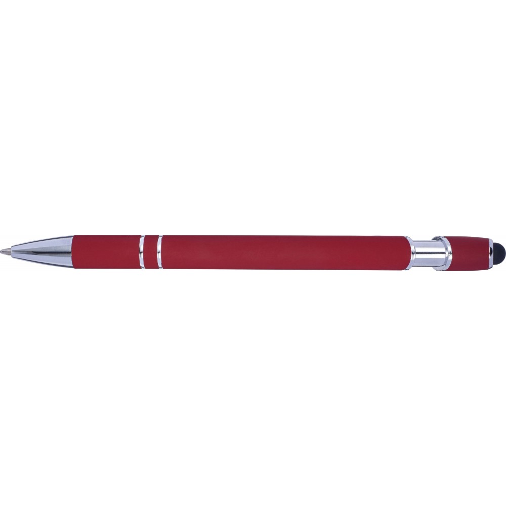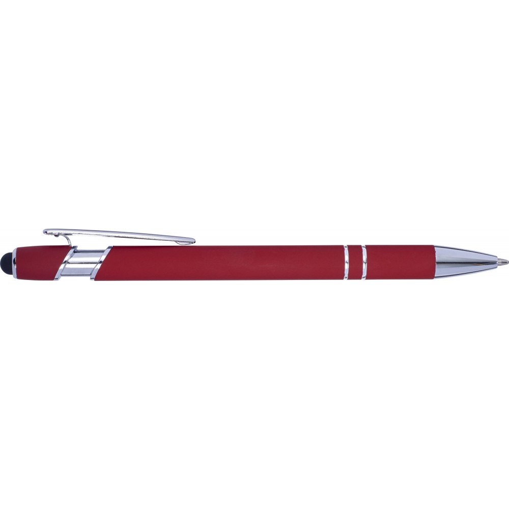 Golyóstoll kék tollbetéttel, gumis felülettel és érintővel kapacitív képernyőkhöz. Kék tollbetéttel. A hegy és a klipsz ezüst színű műanyag. ABS, alumínium. Emblémázás: Gravírozás, UV nyomtatás